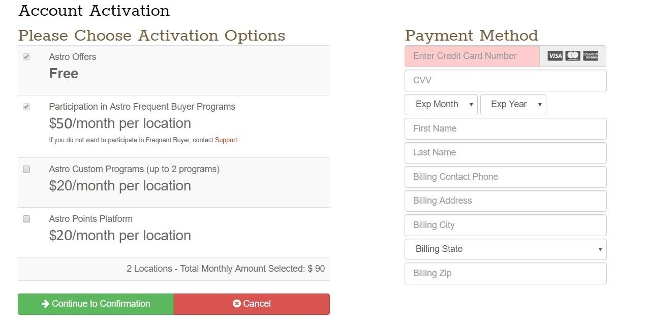 Astro Frequent Buyer and Offers will already be checked for you. If you want to add additional services such as Custom Programs or Loyalty Points you can check those boxes as well.