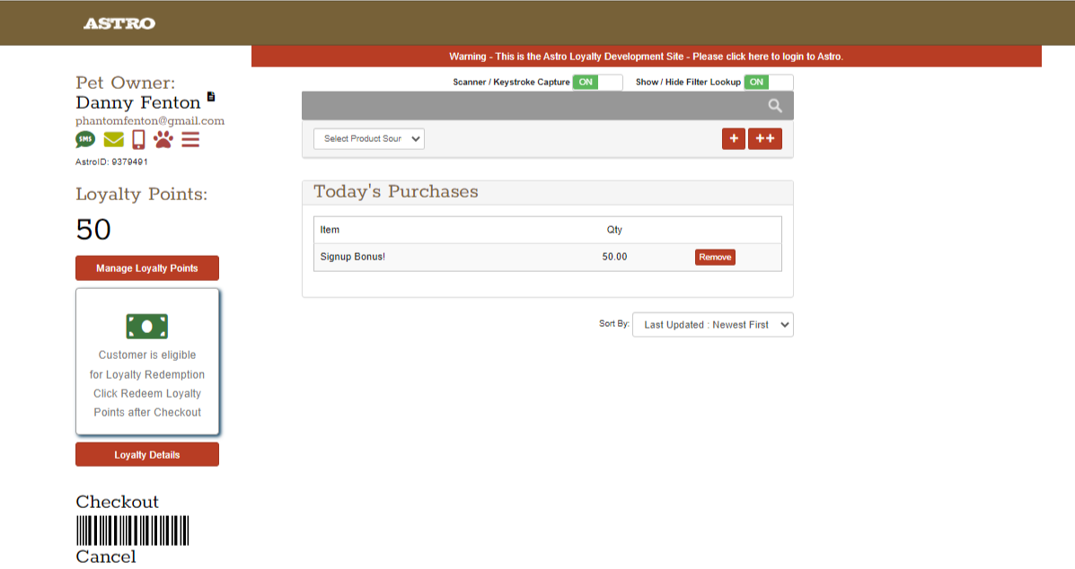 If you chose to award the customer On Purchase during their pet's birthday month, when in Checkout on Astro enter in their purchase and select Manage Loyalty Points.