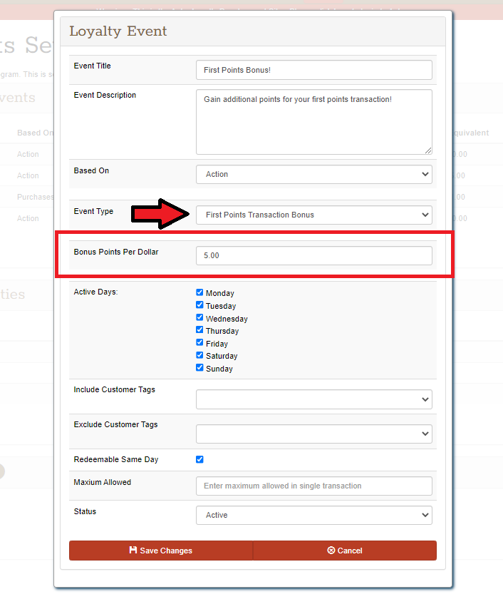 This action means that you can award your customers with a bonus amount of points for their first points transaction entered into Astro. Select "First Point Transaction Bonus" as the Event Type and enter in how many points per dollar you want your customer to earn during their first point transaction.