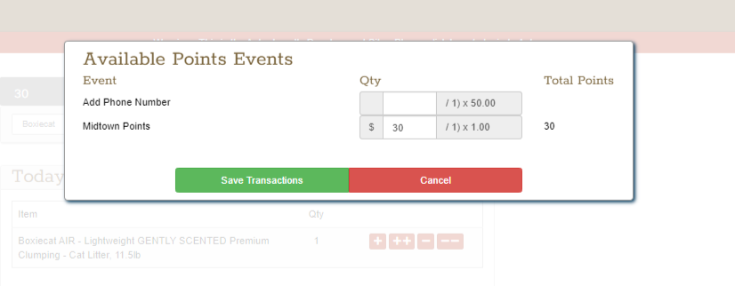 In this example, our customer purchased a bag a litter and is earning 30 points for that purchase.