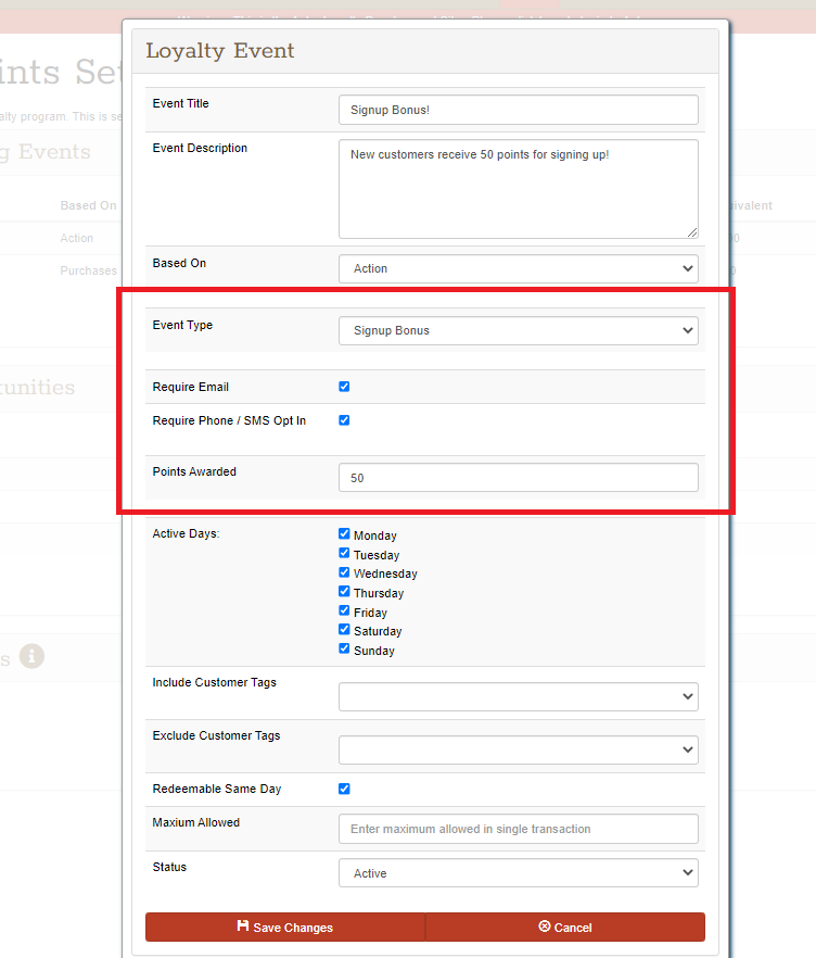 If you select Signup Bonus as the Event Type, you can use this option to allow customers to earn points for signing up on Astro.