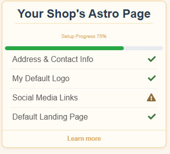 This section is tied to your Astro Landing Page. You will see a Checkmark if all sections have been filled out, an ! if there is partial information missing, or and X if the information was not entered.
