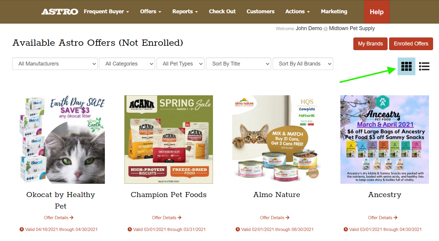 Grid View will allow you to see both your Available Astro Offers and your Offer Shelf Talkers as clear images. This is great for those who prefer using images to help them find what they are looking for.