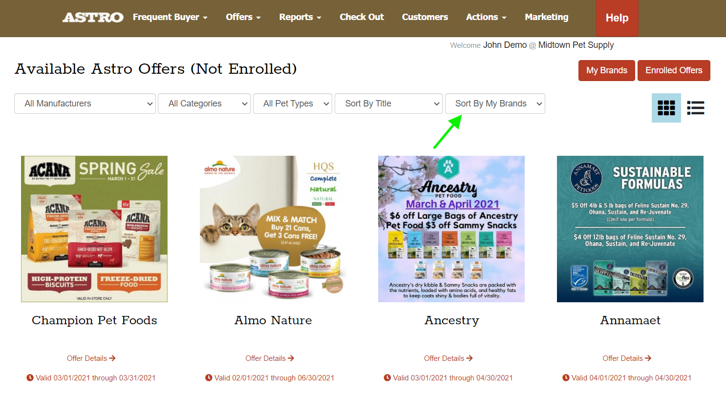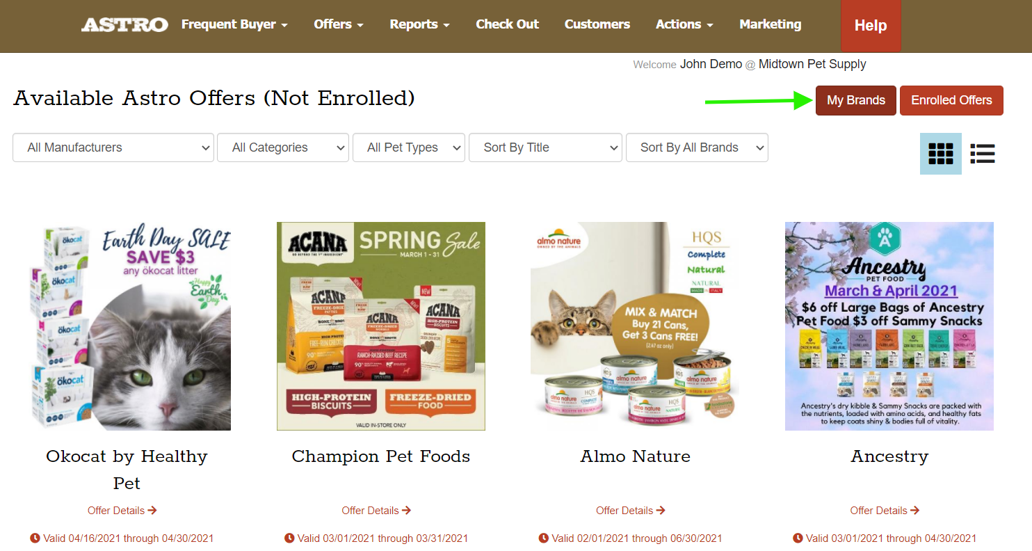 What is this you ask? We want you to be able to create a menu of all the brands you carry in your store! Once you have all of your brands selected and saved you will be able to apply it as a filter to all available Offers listed. This will help you focus in on the Offers that pertain to the products you carry at your store. It will also help ensure that when one of your favorite Brands decides to launch an Offer for the very first time on Astro, that you won't miss out on it!