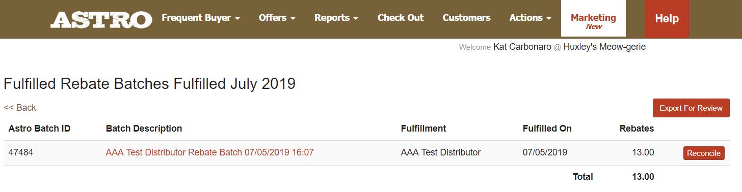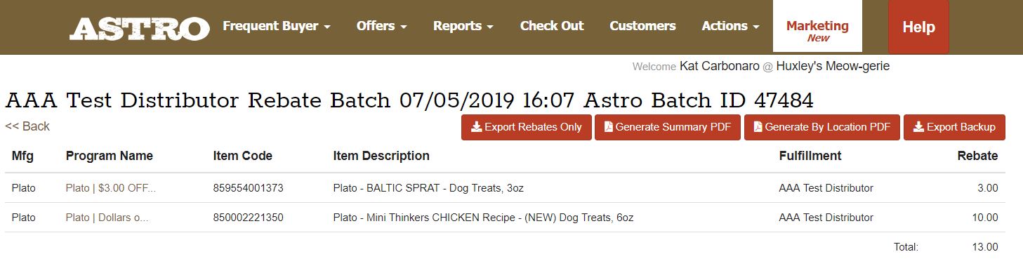 Distributors have their own fulfillment accounts on Astro. When they log into their Astro account they see a report very similar to the one you see. Their report contains three folders - Unbatched Rebates | Unfulfilled Rebates | Fulfilled Rebates. When a cashier redeems a Rebate Offer on your account it will show up under your distributor's Unbatched Rebates folder. From this folder the distributor can choose to either batch these individual redemptions according to the brand manufacturer or according to the retailer. Let's say the distributor batches according to the Brand Manufacturer- Plato, then that Batch Report will contain all retailers who have reported Plato redemptions recently. If they batch according to one retailer, then the Batch report will contain all brand redemptions reported recently by that single retailer.
