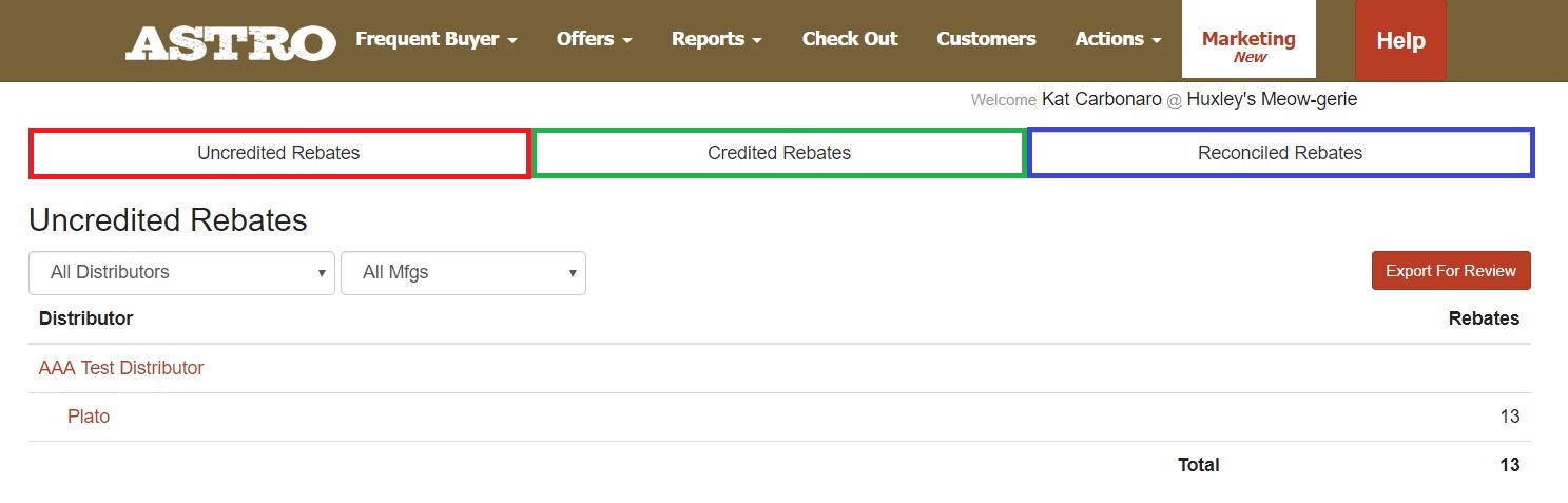 - Rebate Offers - These Offers reward the customer with a set Dollar Off discount that is meant to be deducted from a specific item rather than from a total sale. Customers must purchase an item associated with the Rebate Offer in order to earn that set dollar off reward. These redemptions are compiled under Distributor Rebate Credit Batches. Since the dollar off discount is a set number, rather than a relative number associated with the redeeming of a Free Good, these reports will contain specific mention of money owed to you based on these redemptions.