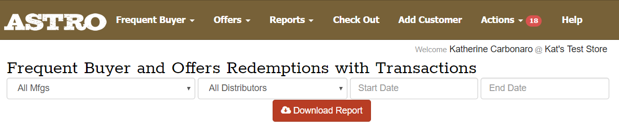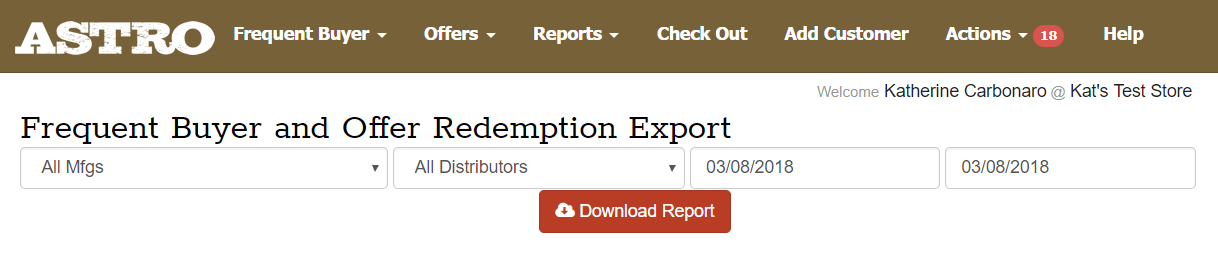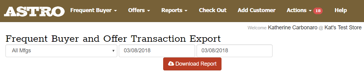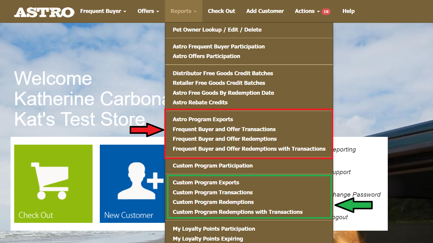 Astro Program Exports are located under the Reports menu on your Astro homepage. These reports can be exported daily so you can compare the transactions recorded on Astro with those entered into your POS system. They can also be exported monthly so you can see how many redemptions occurred on a monthly basis. You can export for any date range that you choose.