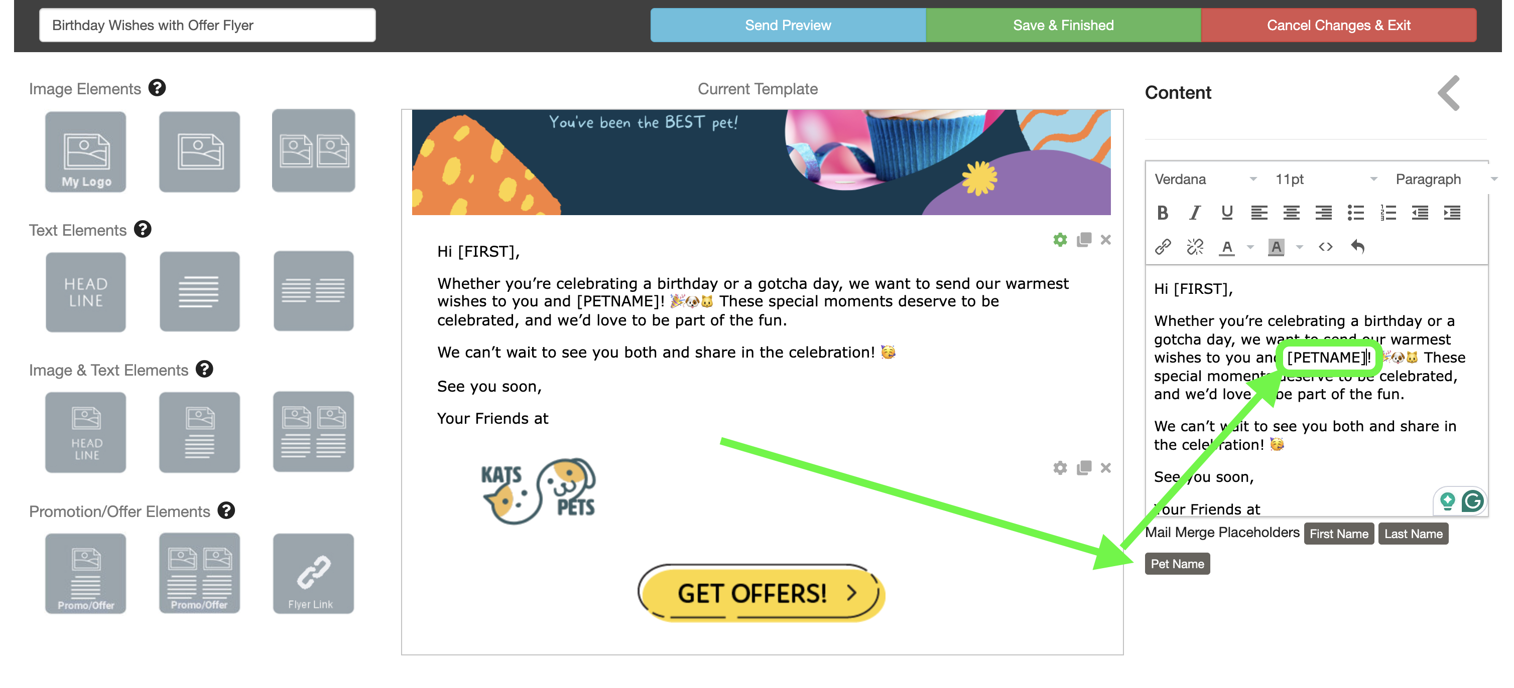 When editing your email template, click the text to open the text editor. Click the Pet Name button to insert the [PETNAME] mail merge placeholder into your message. When the automation sends, [PETNAME] will be automatically replaced with the name of the pet celebrating a birthday that month.