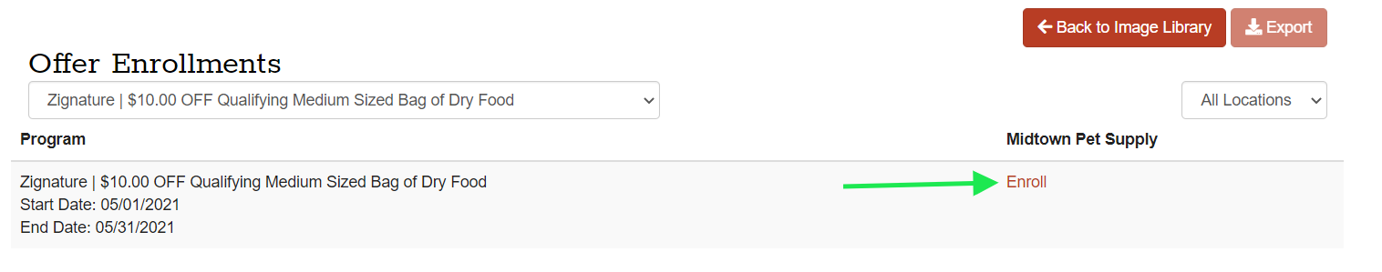 If you see an Offer listed in your Brand Media Library that interests you, you click on the image to see it's details. If you would like to participate, click the red button to Enroll! This will take you directly to the standard Offer Enrollment page where you can select your distributor. Once you complete the enrollment process you will be returned to your Image Library, picking up where you left off.