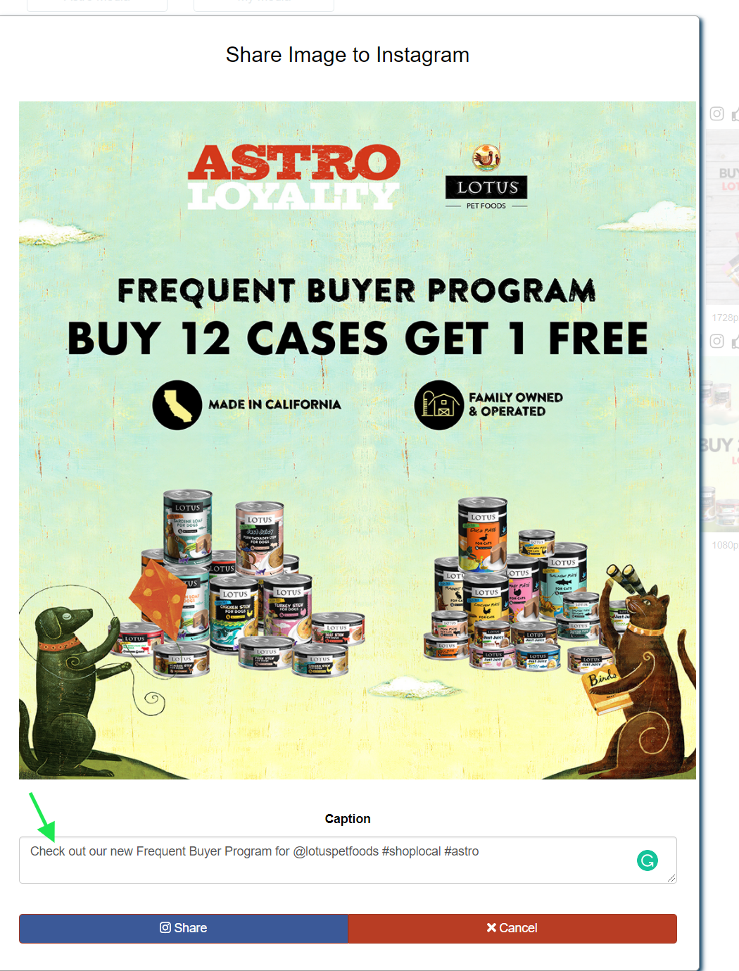 Click on the social icon of your choice above the image you wish to share. Type in your caption along with any @tags or #hashtags. Then click Share.