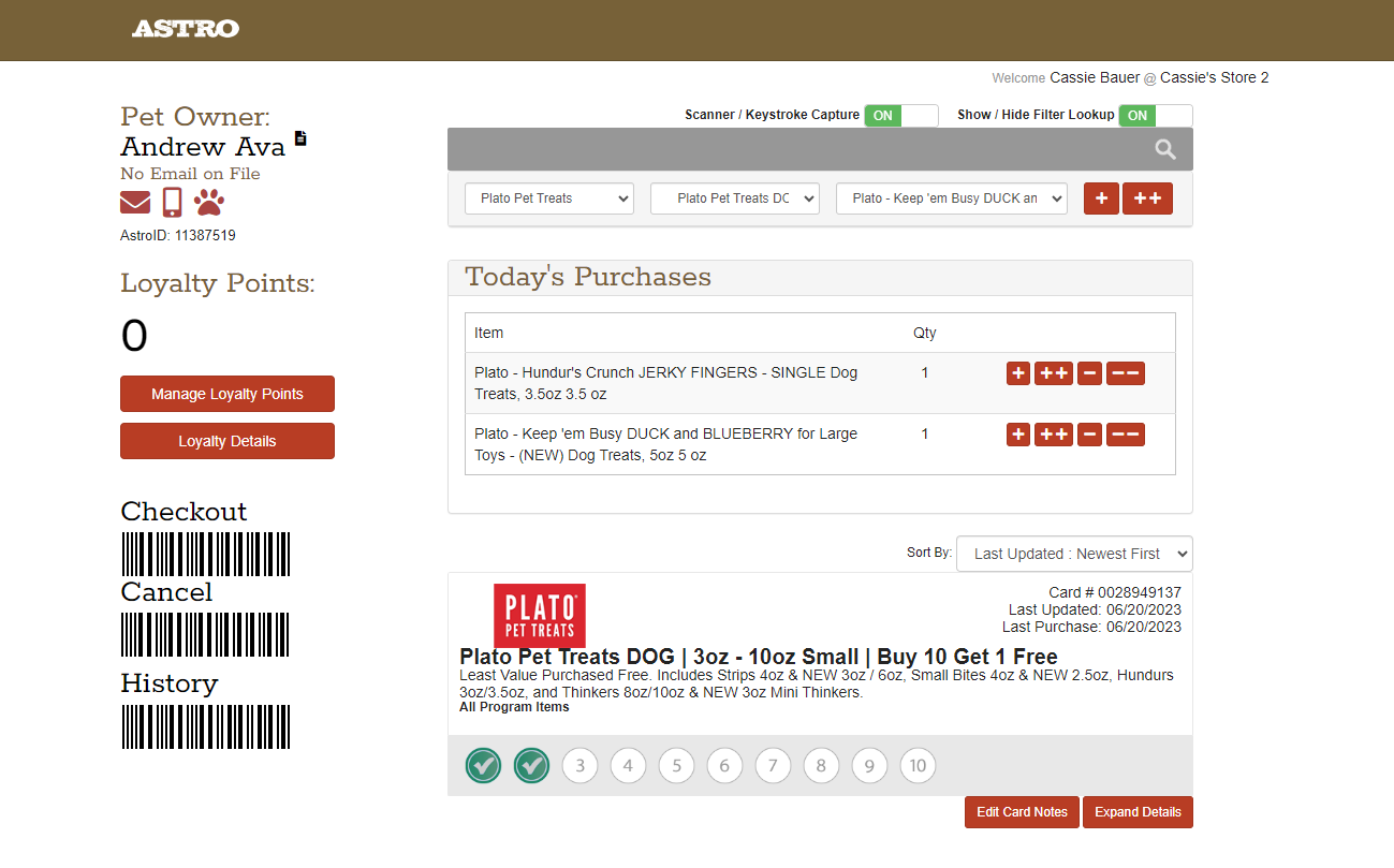 A new tab will be opened and you will be routed to the Astro Loyalty checkout page, where the client will be linked and all the products added to the ticket will be available under Today's Purchases.
