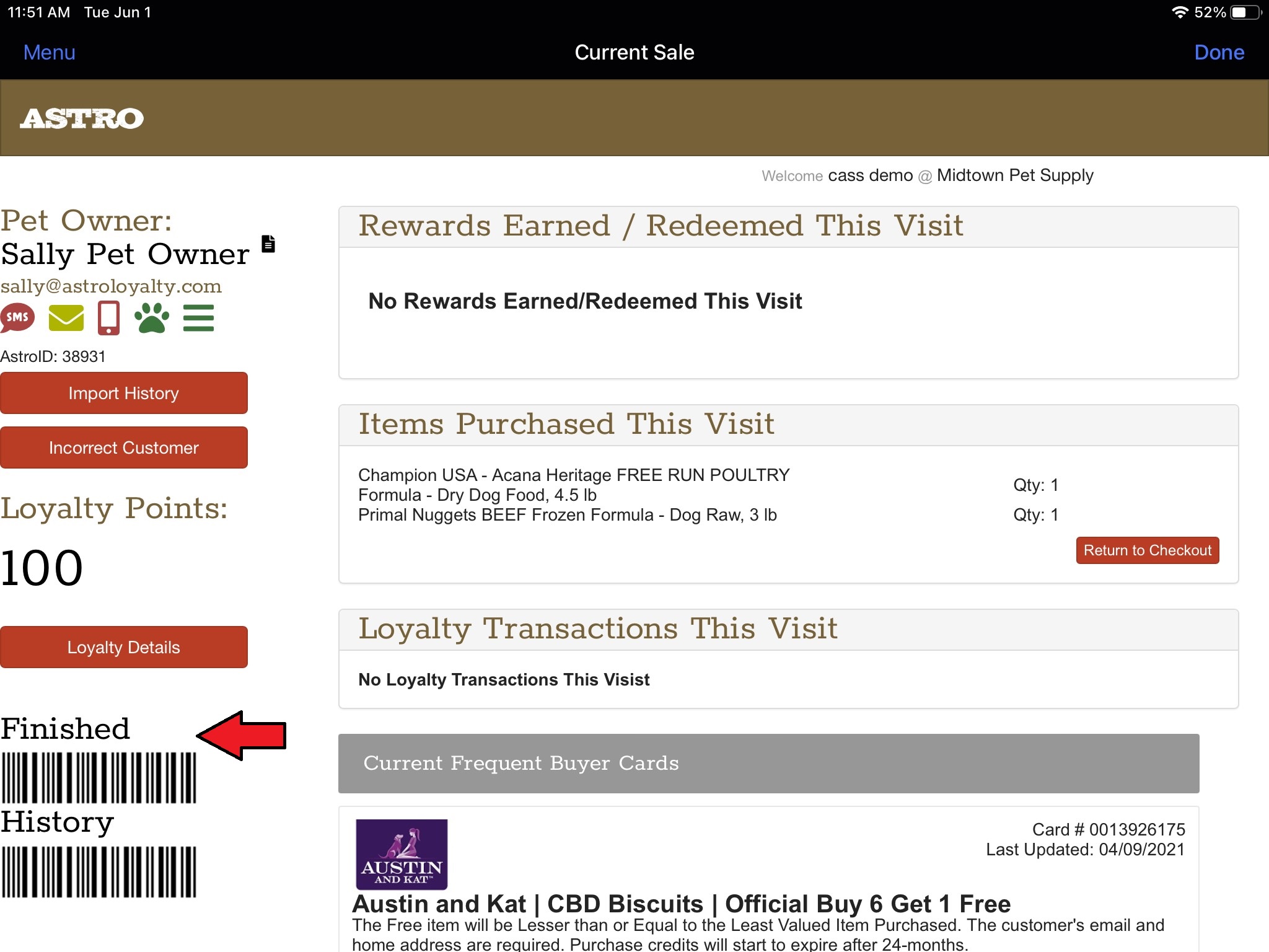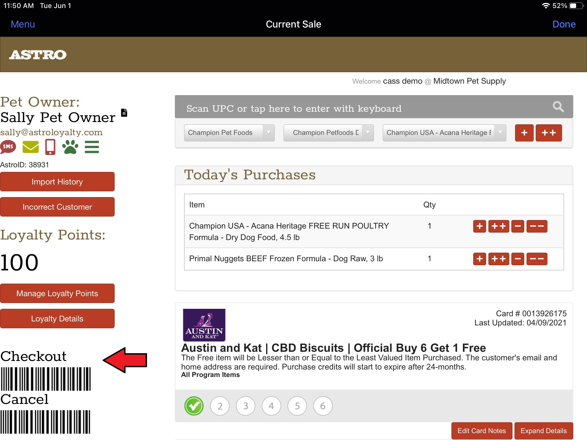 8. You have now linked this customer's Lightspeed account to their account in Astro. Now every time you click the Astro Loyalty button on their Sale screen in Lightspeed it will take you directly to this account in Astro. The integration will add all the items you scanned into Lightspeed to Astro under Today's Purchases. Once you are confident that their qualifying purchases have been added correctly you can click "Checkout".