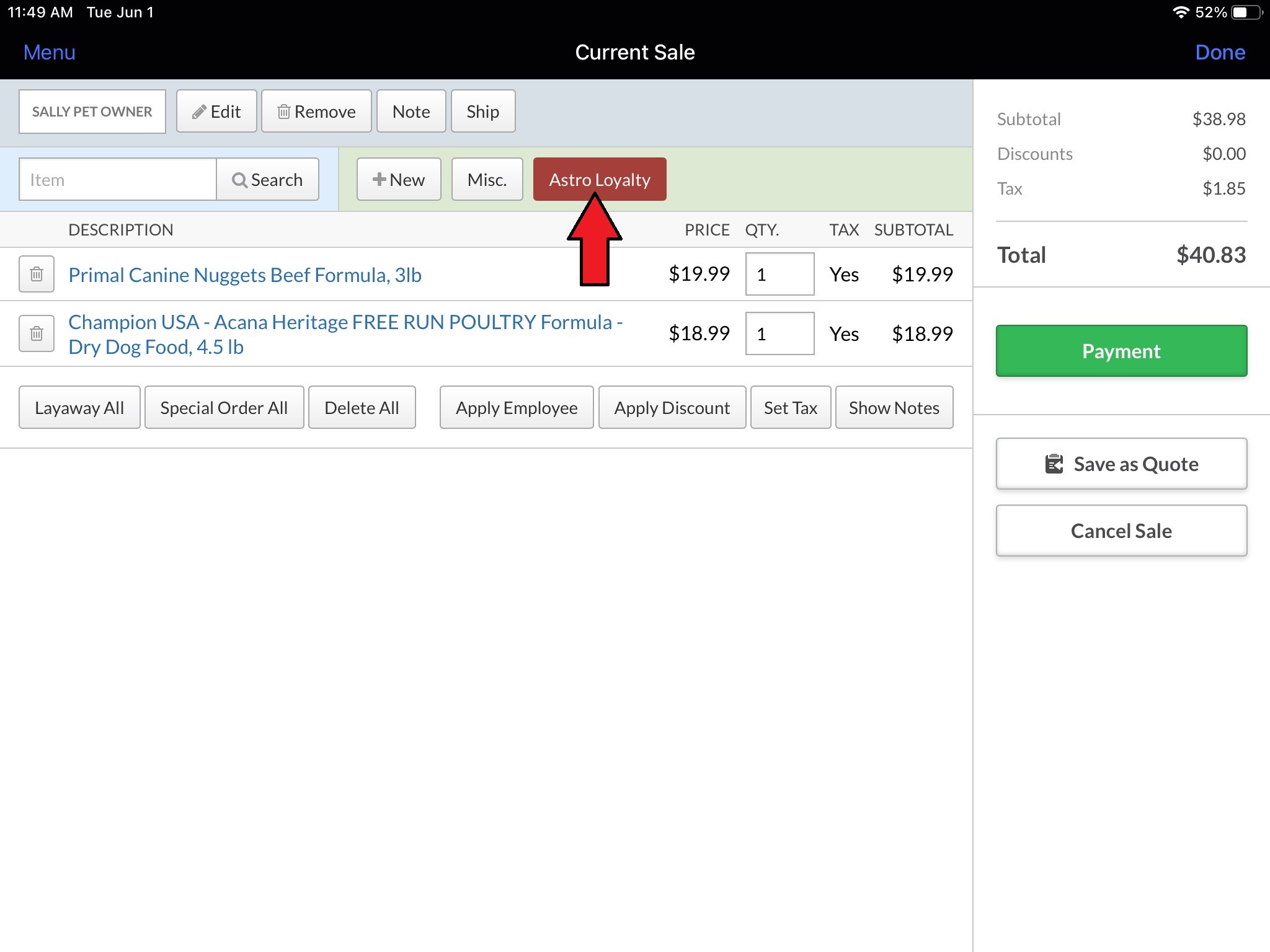 The integration will then enter your Lightspeed customer's information into Astro for you. When everything is entered to your satisfaction select Save Pet Owner.