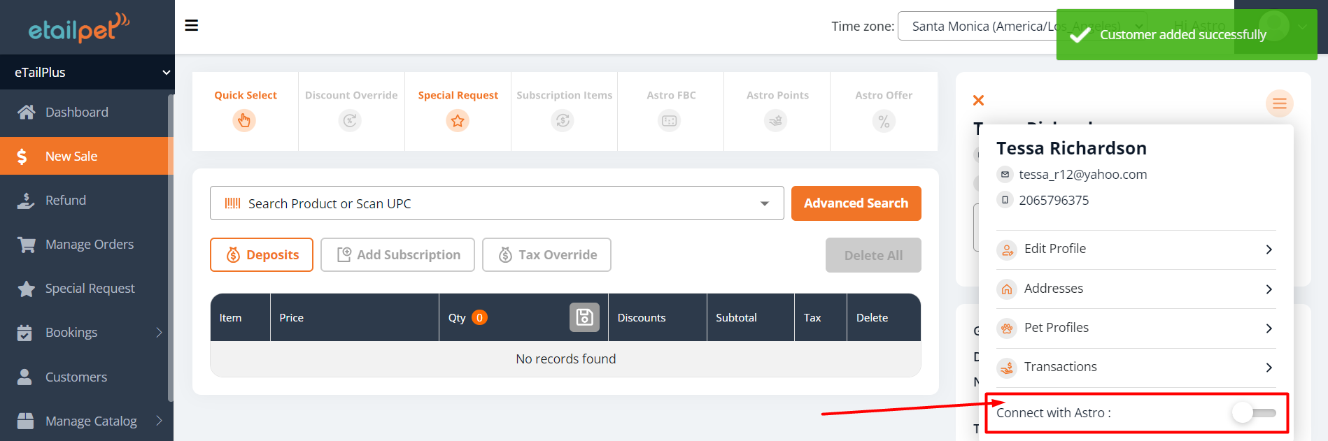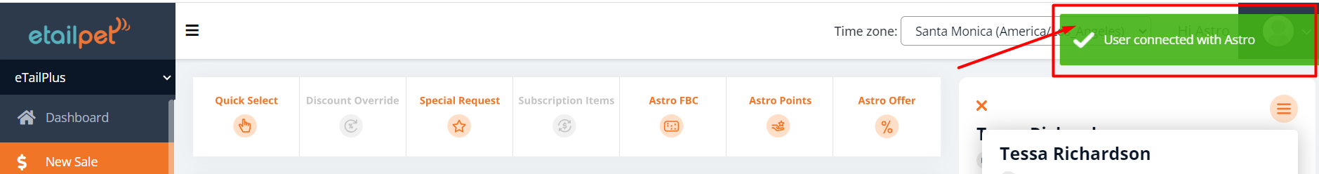 You can then click on the "Connect With Astro." You should then see a green box in the top right corner say "User connected with Astro" This will create a new Astro account for this customer.