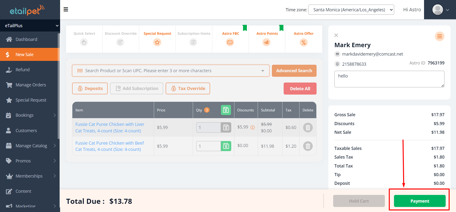 6. It will discount the free item. Select Payment. (The customer's may still need to pay taxes on their free item, please consult your state laws for more information)