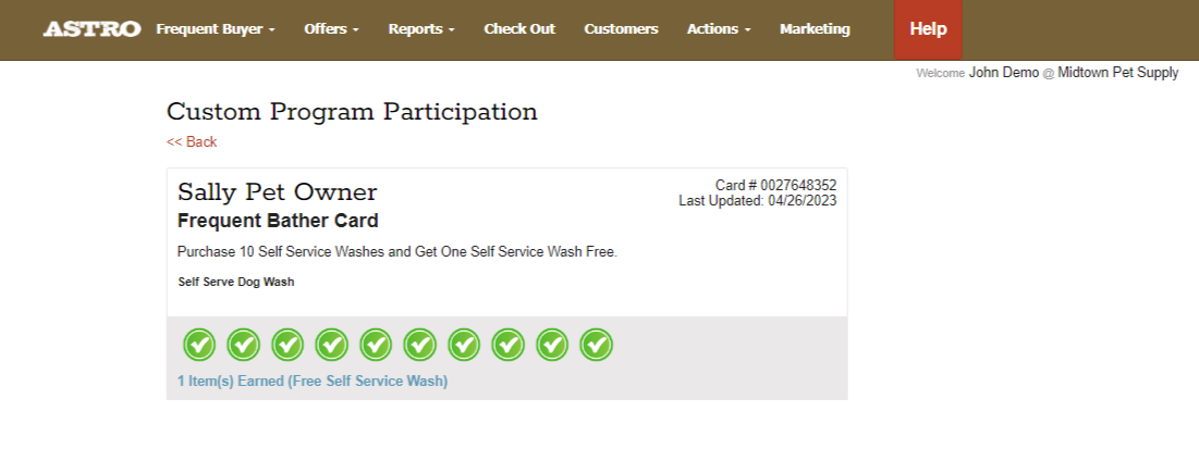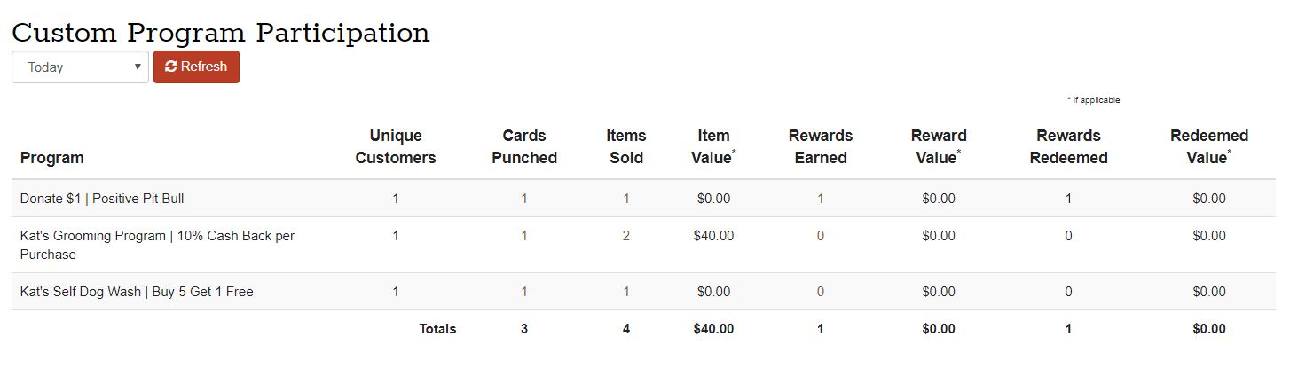 If you want to learn more about how these kinds of programs function check out this article: My Custom ProgramsThe example below is for both a Free Good program and a Cash Back program. Cards Punched, Items Sold and Rewards Earned all have numeral links that you can click on to expand the details of the report for that category. The Item Value, Reward Value, and Redeemed Value will only present you with information if you are running a Cash Back program. The report will default to Today, if you want to change the view to Yesterday or to a Custom Range you will need to click the Refresh button after you make your desired selection.
