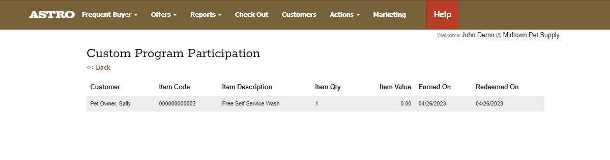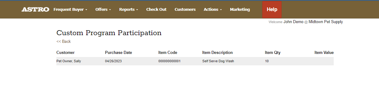 If you click on the number in this column, you will see the purchase information. It will show you the customers Name, Purchase Date, Item Code (UPC listed for your Custom Program Items), Item Description, Item Quantity, and Item Value (If a Cash Back Program).