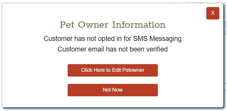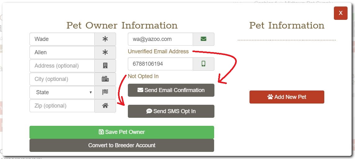 If the customer decides to prpvide the missing information the cashier can click the "Edit Petowner" button. This will to bring up the customer information editor where they can input the new information. Make sure to send an Email Confirmation if their email address is Unverified, or Send an SMS Opt In Text if they have not yet Opted In to receiving text messages.