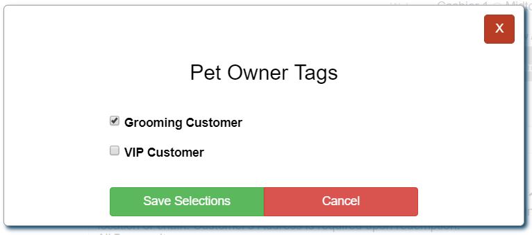 Here you can add additional identifying tags to customers. Later on, you can use these tags to generating Marketing Lists. These tags can be added to a customer's account while either creating their account with Add Customer or while Checking Out a customer by clicking on the Pet Owner Tag Icon.