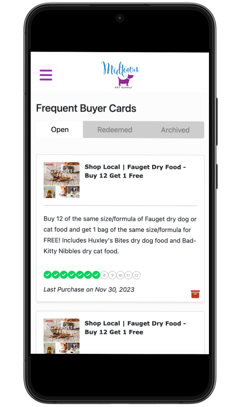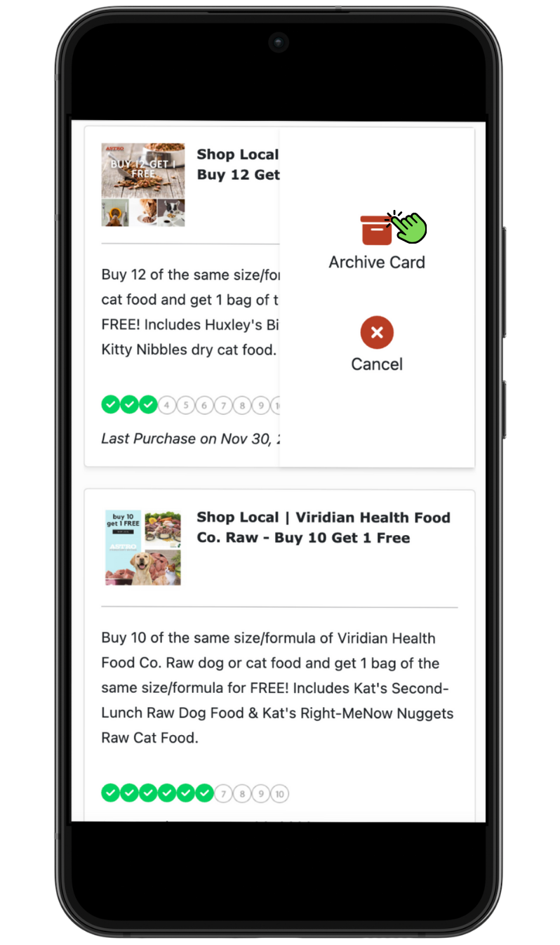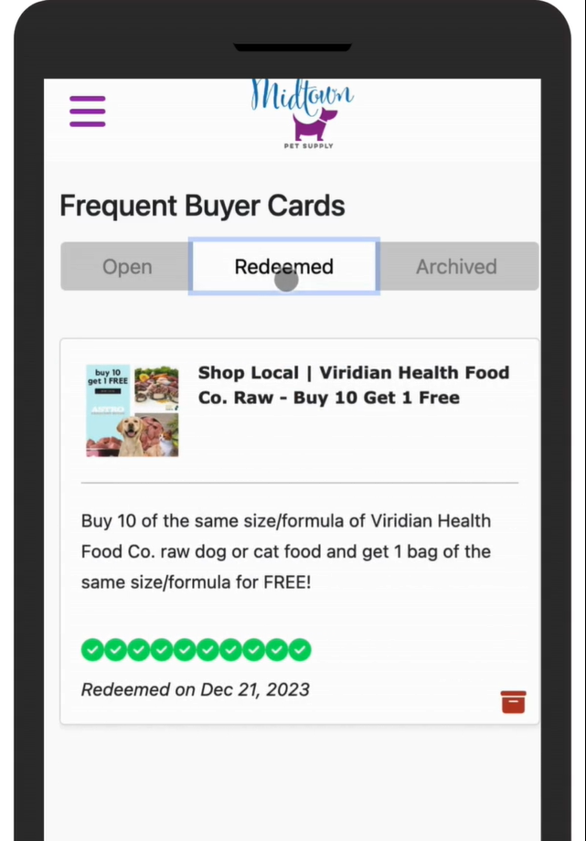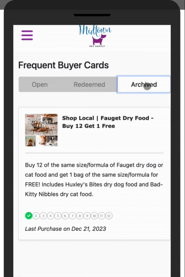 3. This will move the frequent buyer card to your Archive tab. To view, on the Frequent Buyer Cards menu click Archived.