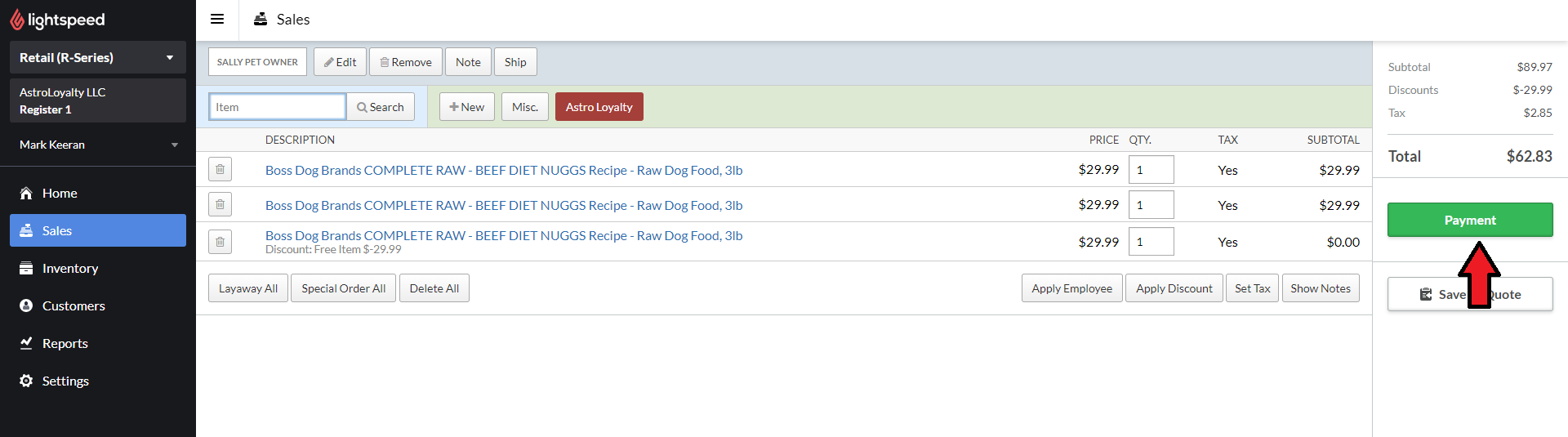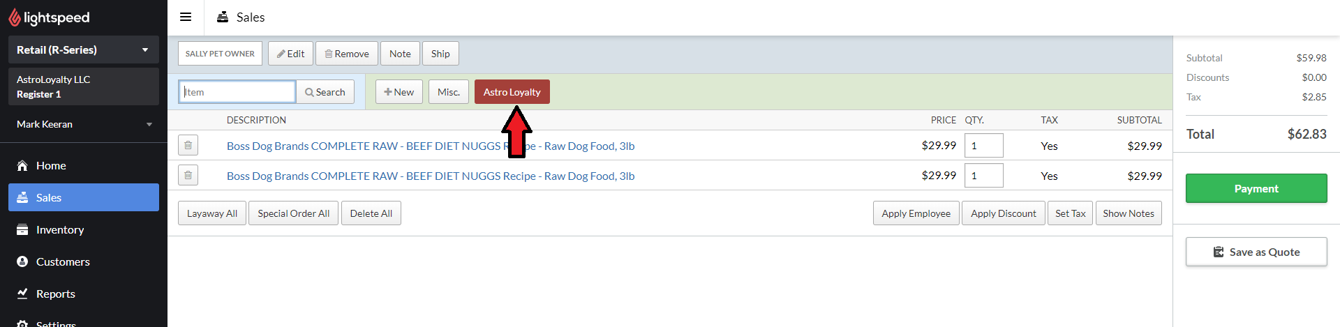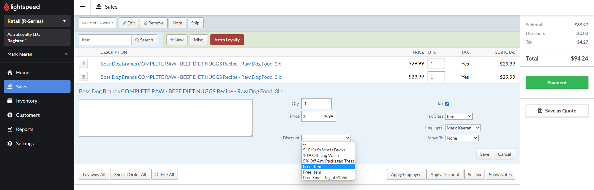 12. This will take you back to the Lightspeed Sale and now we will add the item that we just redeemed. You need to manually apply the discount to the sale and collect your payment. How you go about this is up to you and the tax laws in your state. We at Astro have absolutely no say in what you do from this point forward. How you manage the monetary part of your sale is literally your business. Case in point, the integration will not apply a discount to your sale for you. We want you to maintain complete control over how you apply your customers' earned discounts to their sale.