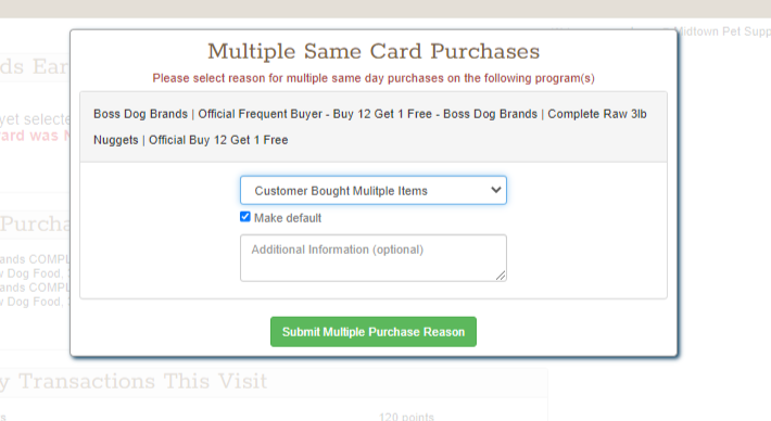 9. If more than one item was added to a frequent buyer card you will see the multi-purchase pop-up, select the appropriate reason from the drop-down menu to move forward.