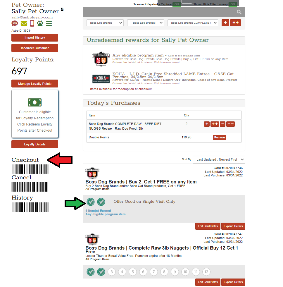 8. You have now linked this customer's Lightspeed account to their account in Astro. Now every time you click the Astro Loyalty button on their Sale screen in Lightspeed it will take you directly to this account in Astro. The integration will add all the items you scanned into Lightspeed to Astro under Today's Purchases. Once you are confident that their qualifying purchases have been added correctly you can click "Checkout".