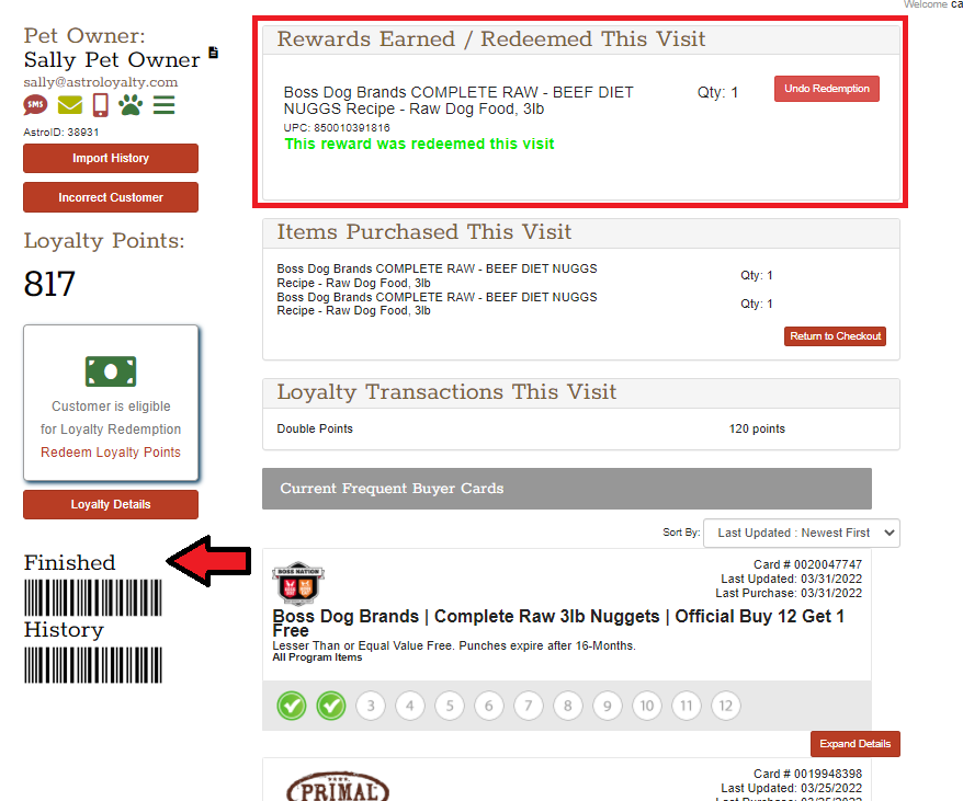 11. If everything looks correct, select Finished. You should see the redemption at the top under Rewards Redeemed This Visit.