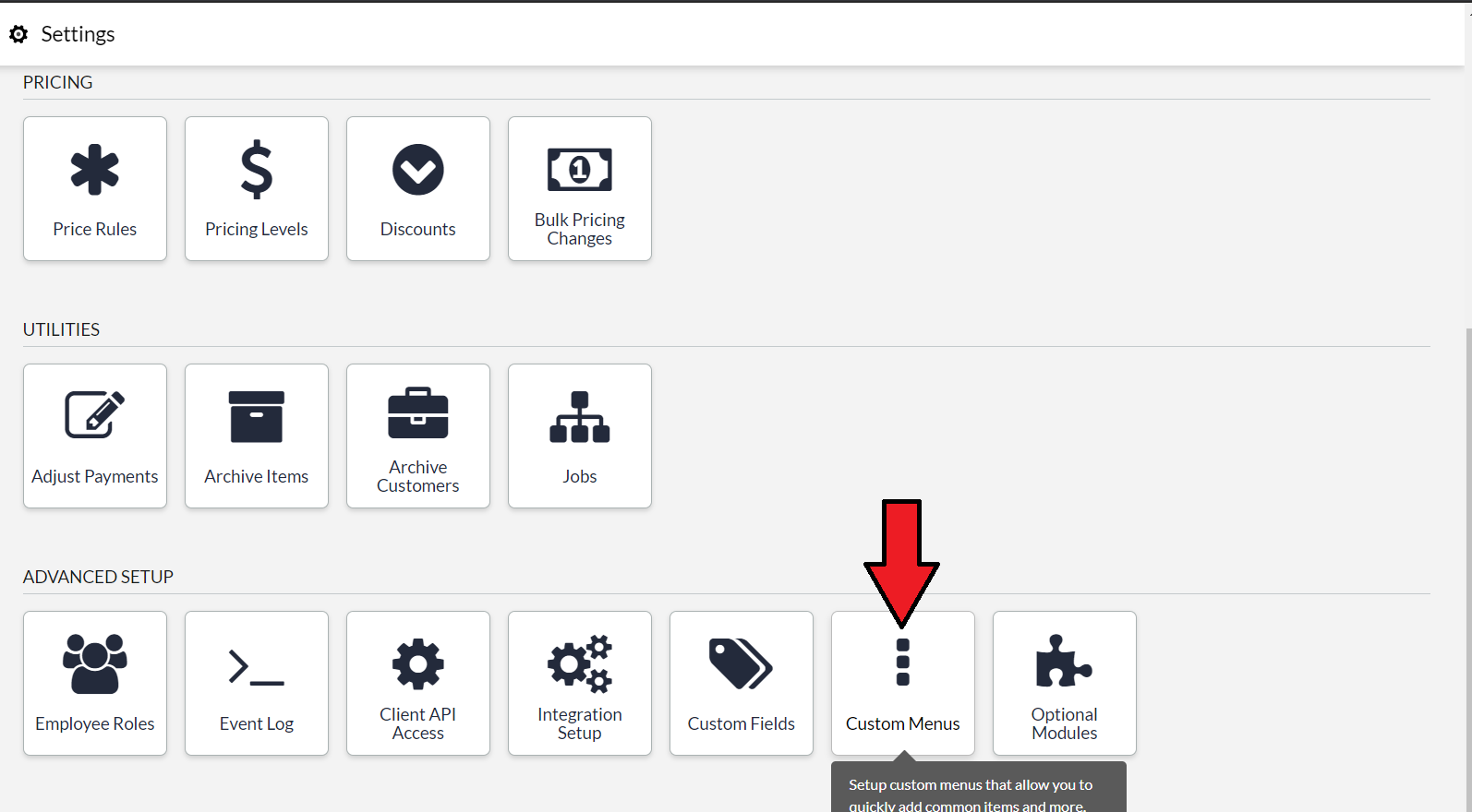 3. Scroll down and select Custom Menus.