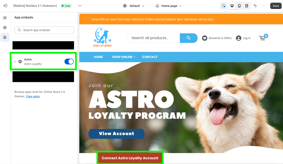 Shopify theme customizer, click “App Embeds” and turn the Astro app on to