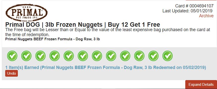 Let's say in this instance, your customer brought a bag of the Primal Duck to the counter to bring home that day. Well according to the rules of the program (Lesser or Equal Value Free) the customer can only choose between the Chicken and the Beef formulas as their free bag (since Beef was the Least Valued item they purchased on their card). So now the customer has a choice to make. They can either choose to put back the bag of Duck and grab one of the eligible items instead, or they can choose to purchase the Duck and grab one of the eligible items to take home for free as well.