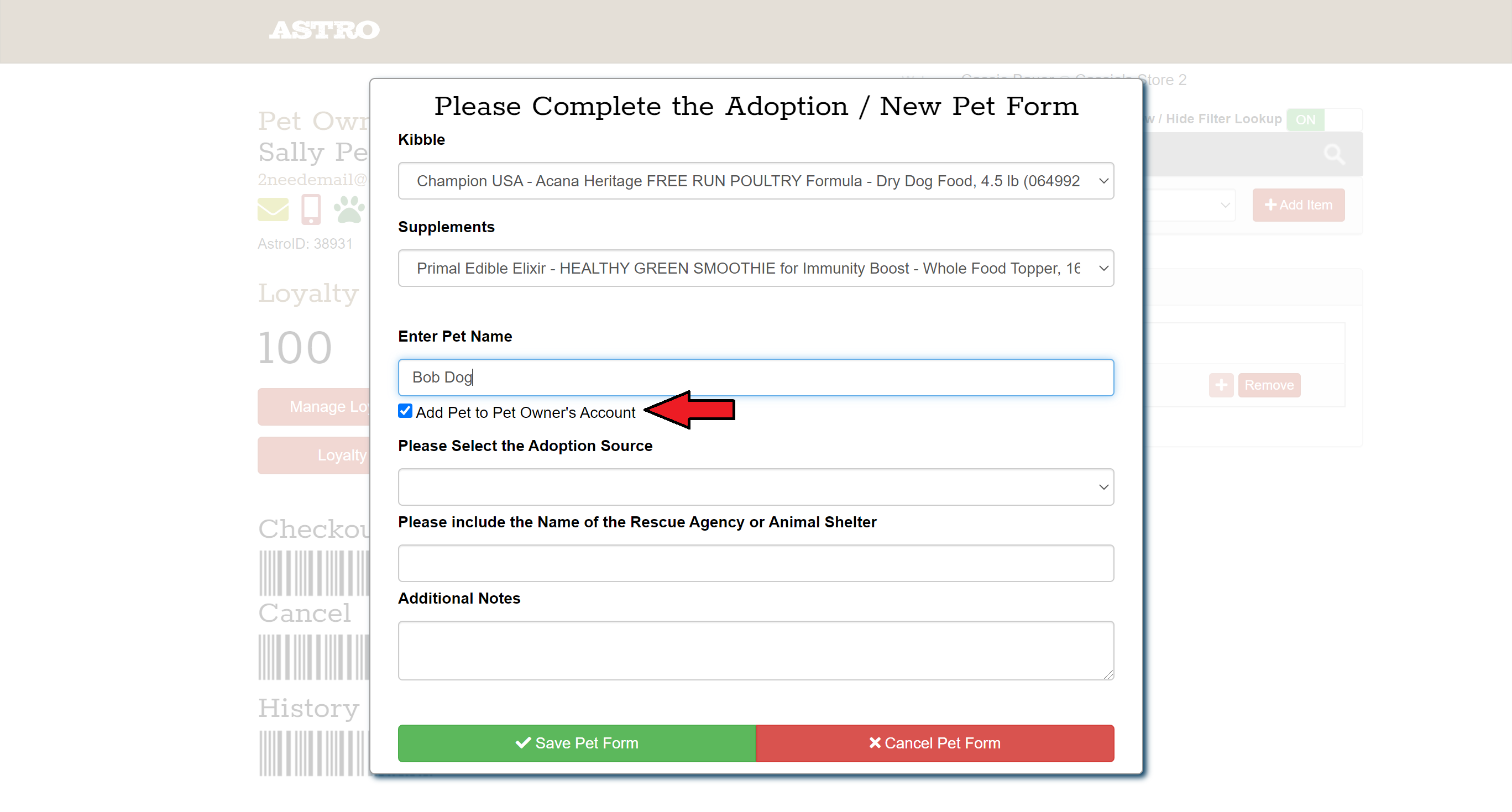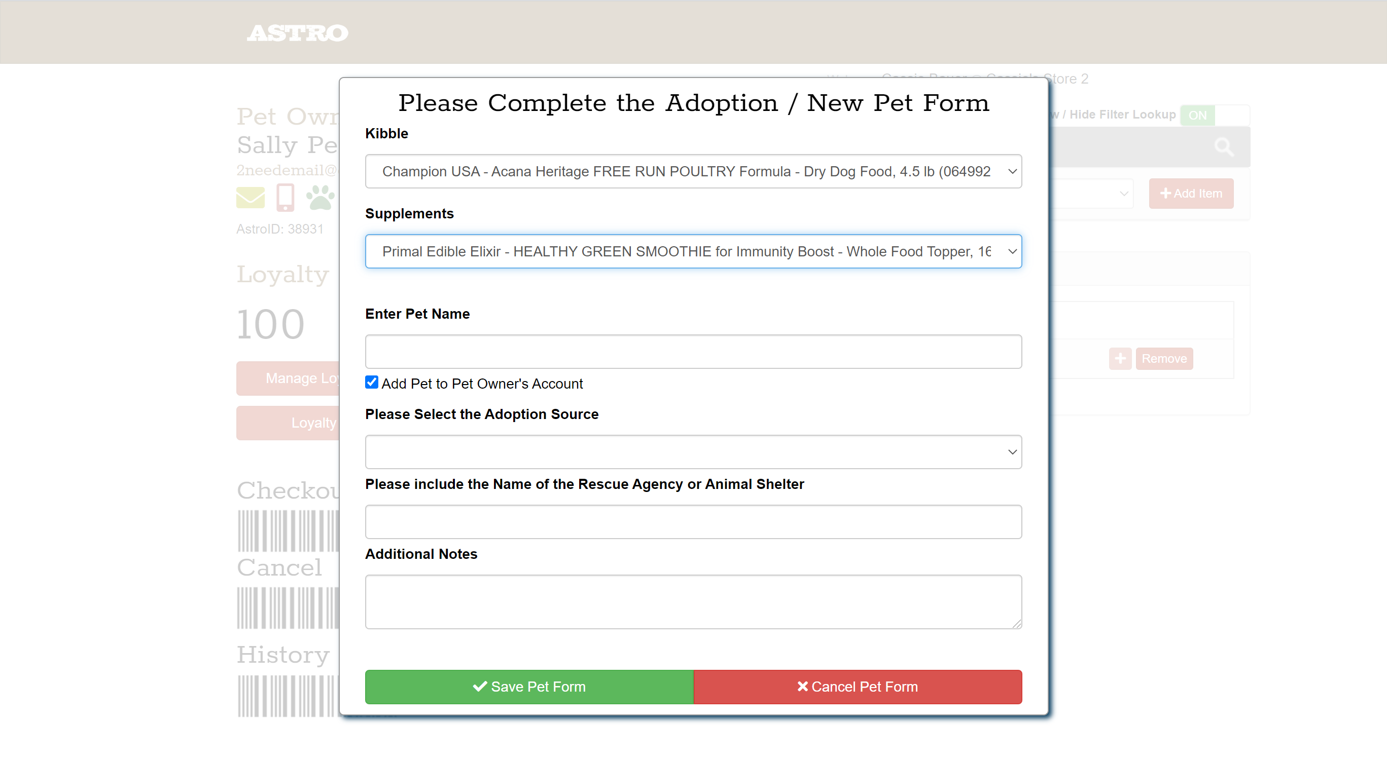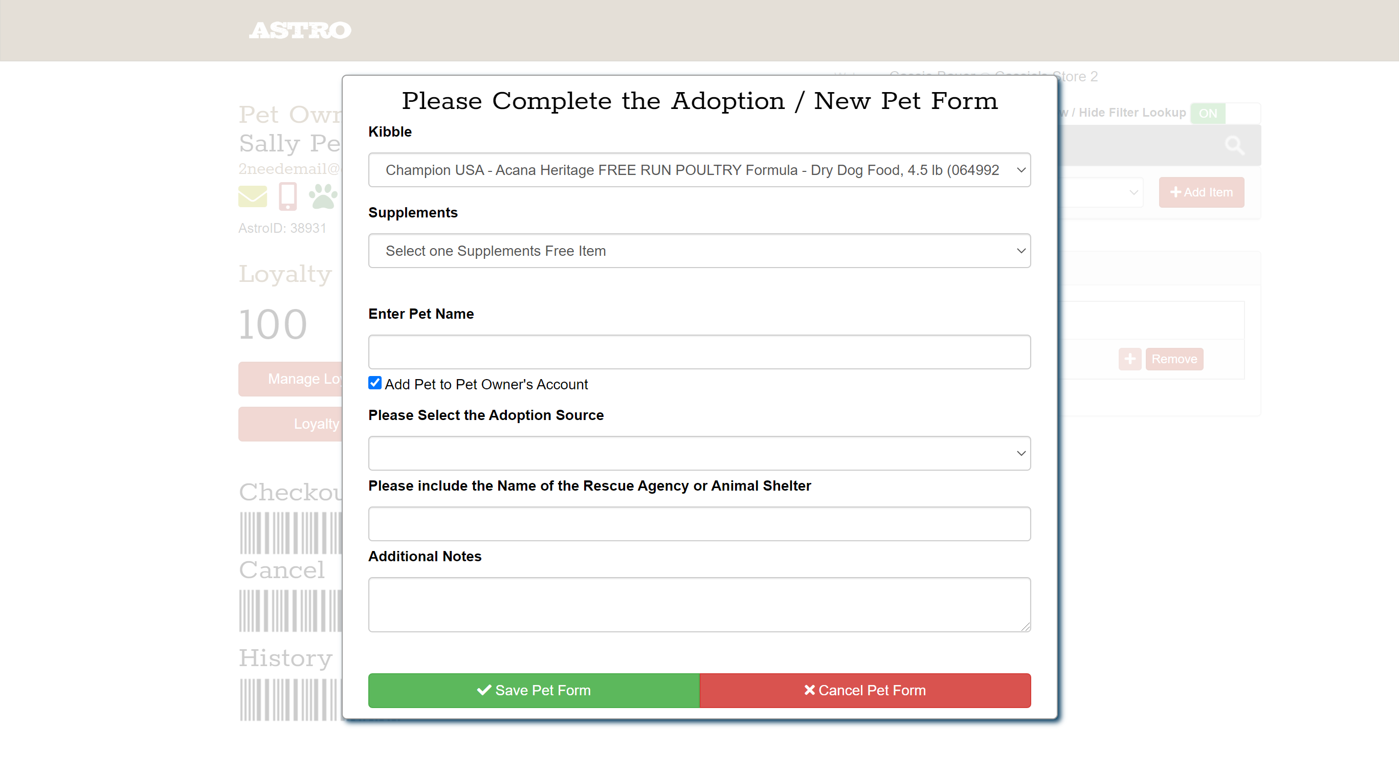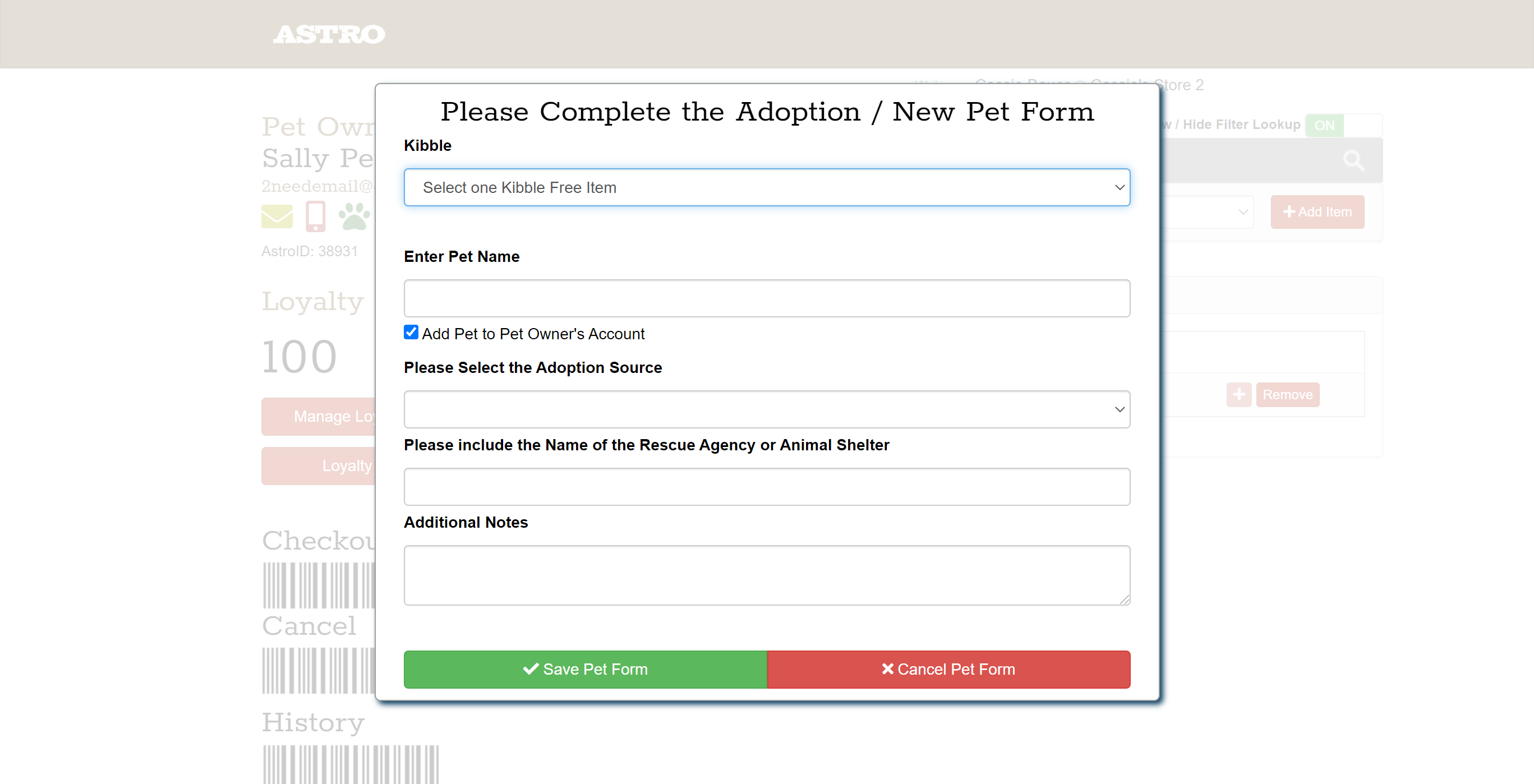 Once you are under the Customer's Pet Owner Checkout screen, you can type the word "astro" followed by the Species of the animal they have adopted. For example, if they adopted a Dog, you would type " astrodog." If they adopted a Rabbit, it would be "astrorabbit." And so on.