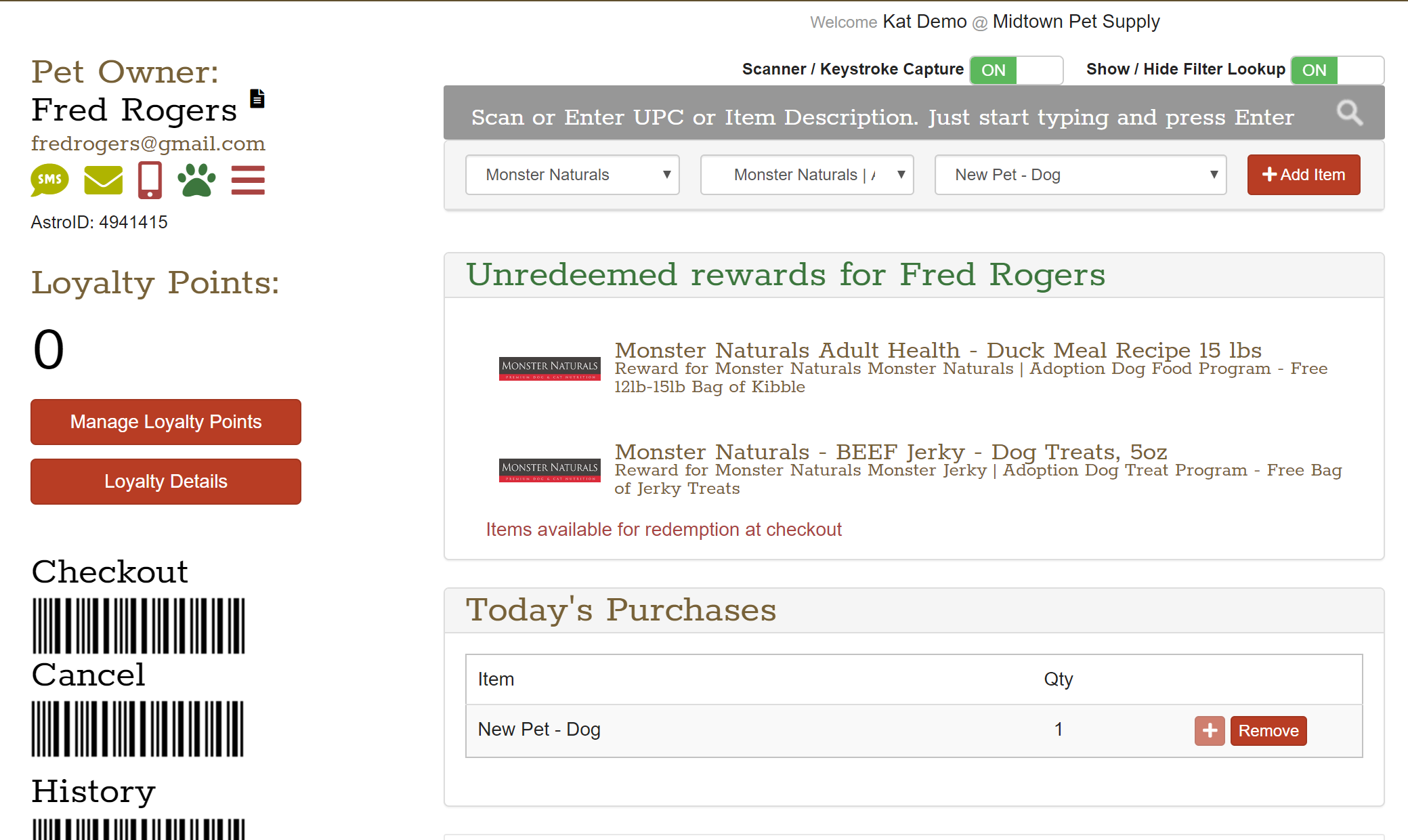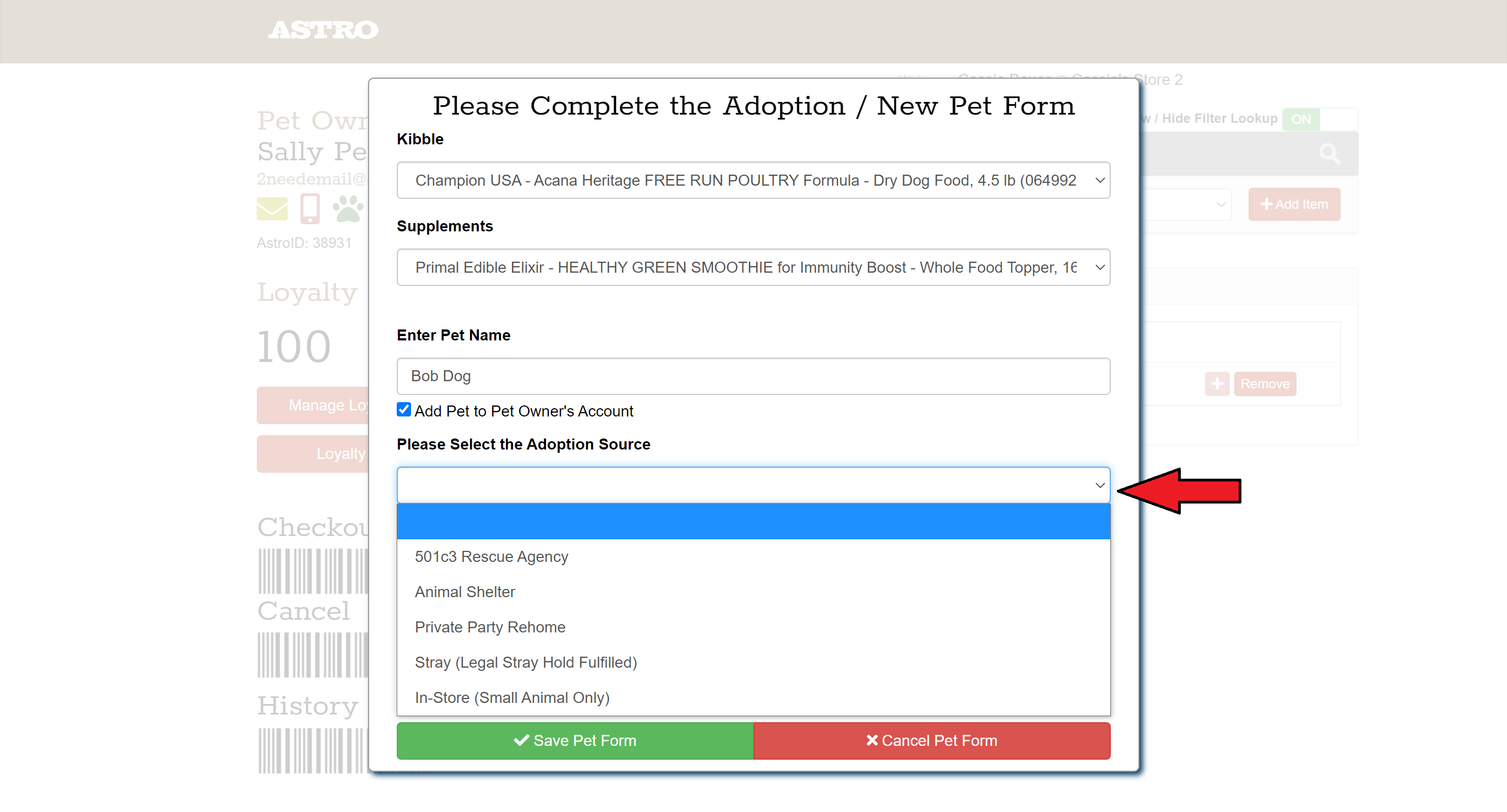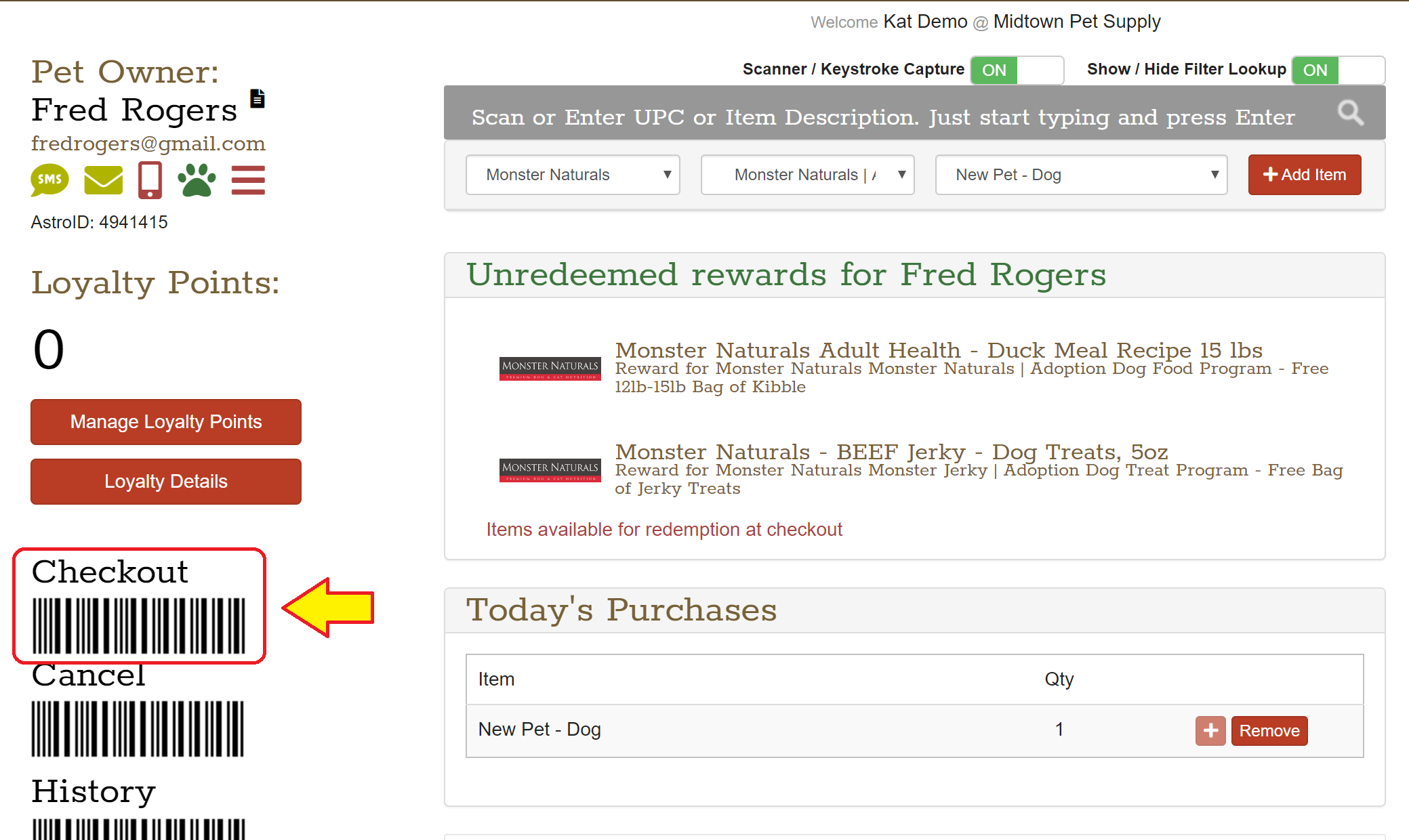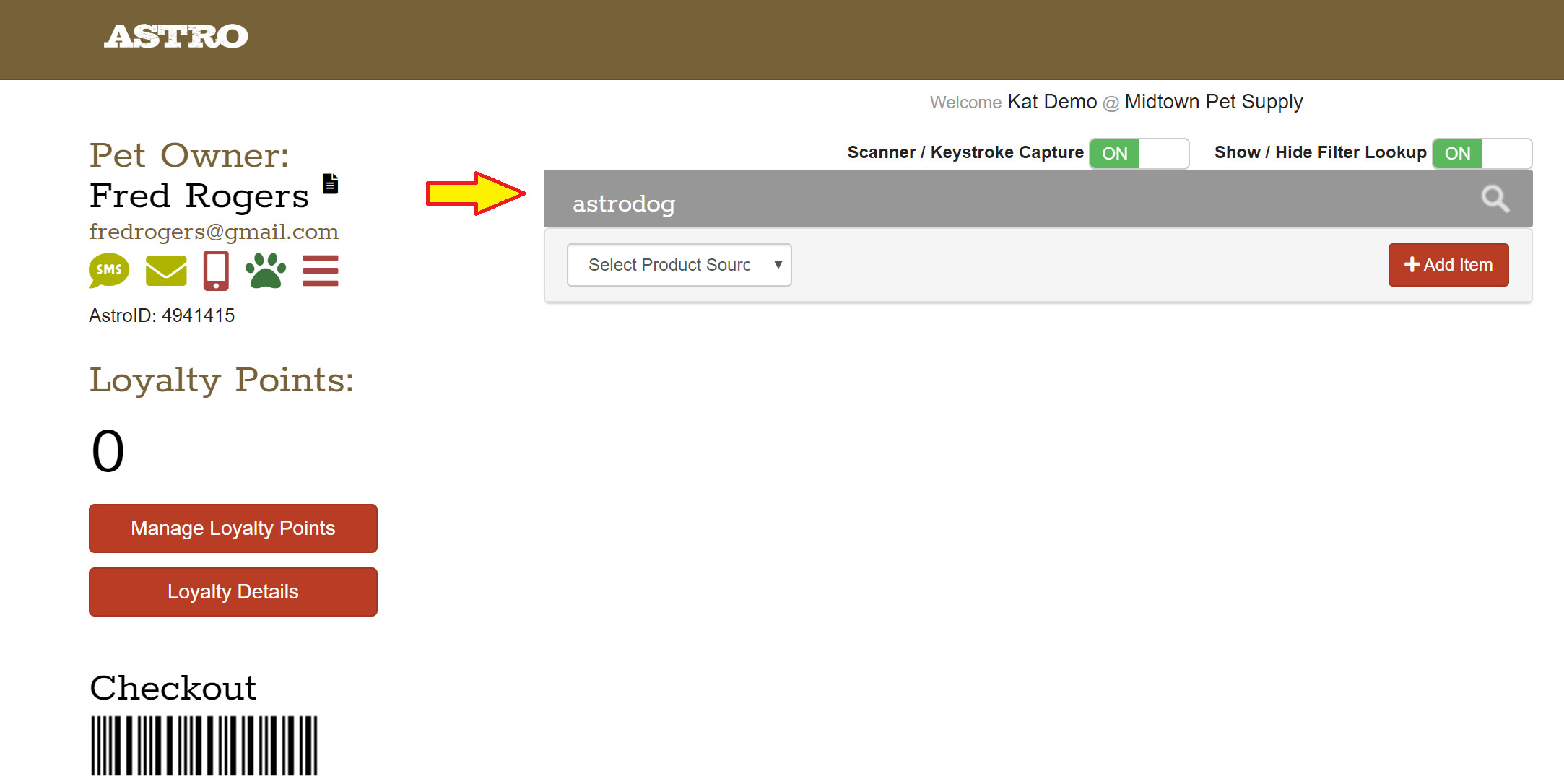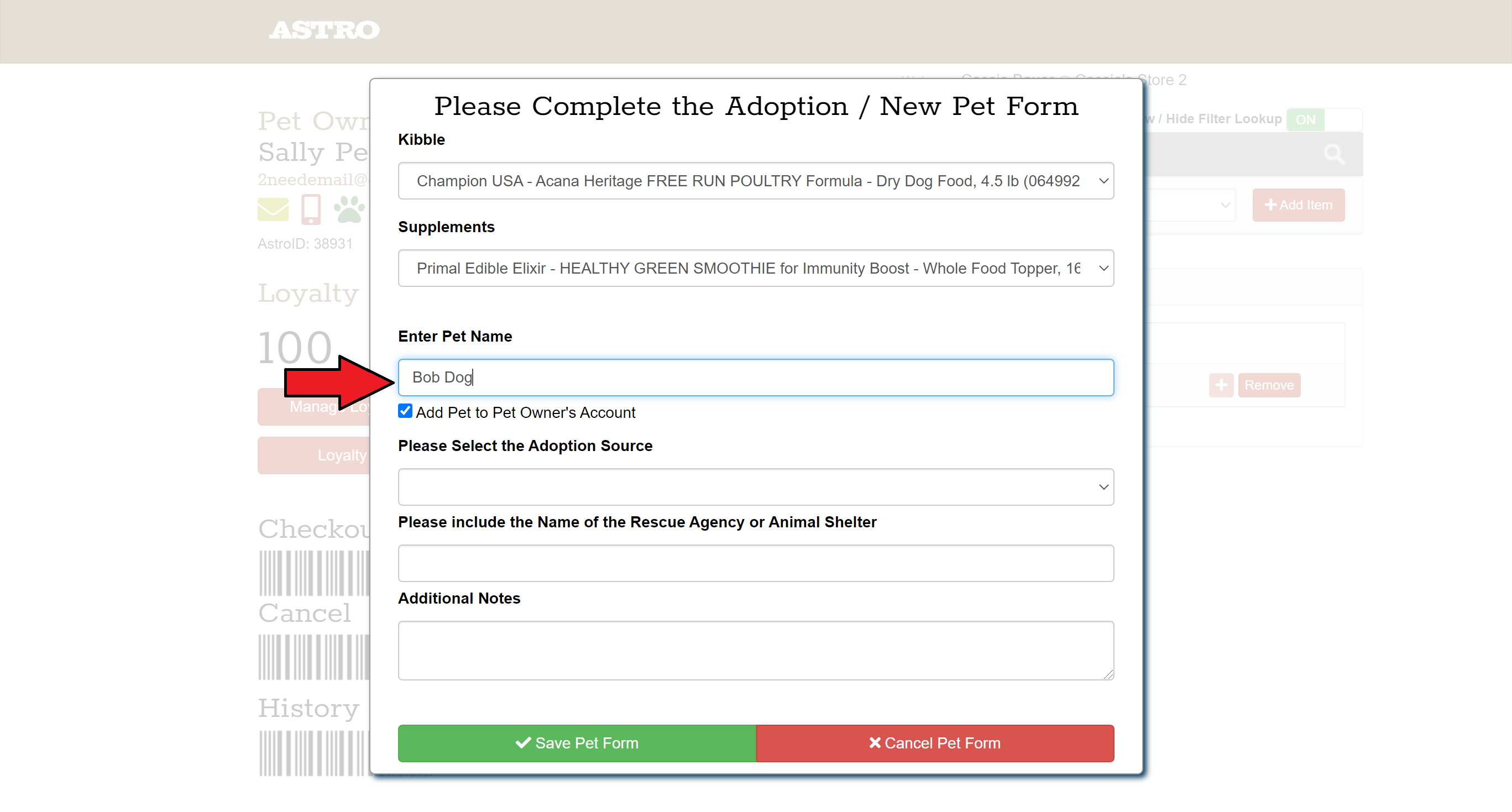 Once you are under the Customer's Pet Owner Checkout screen, you can type the word "astro" followed by the Species of the animal they have adopted. For example, if they adopted a Dog, you would type " astrodog." If they adopted a Rabbit, it would be "astrorabbit." And so on.