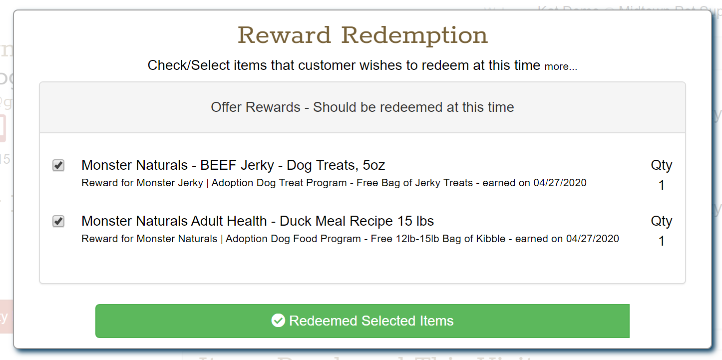 Now all you need to do is check the box beside each item to redeem it for the customer. Make sure you check all the boxes. Then click Redeem Selected Items.
