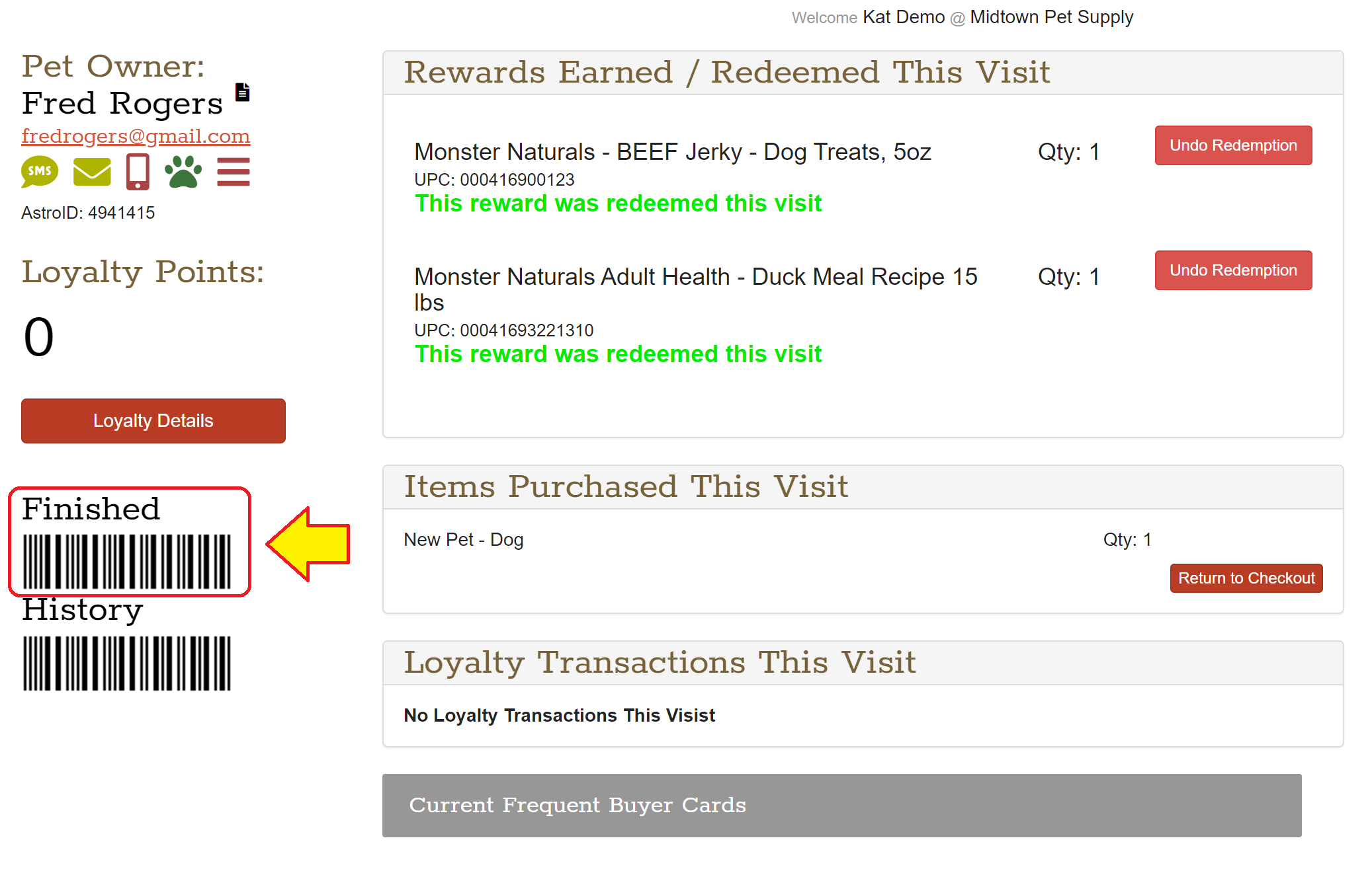 After saving your New Pet Form, you will see a screen similar to mine. At the top of your screen, you will see the Unredeemed Reward Alerts for the Bundle Categories you just selected. Below that will be Today's Purchases and where the New Pet - __ will be mentioned. In this case, we see New Pet - Dog.