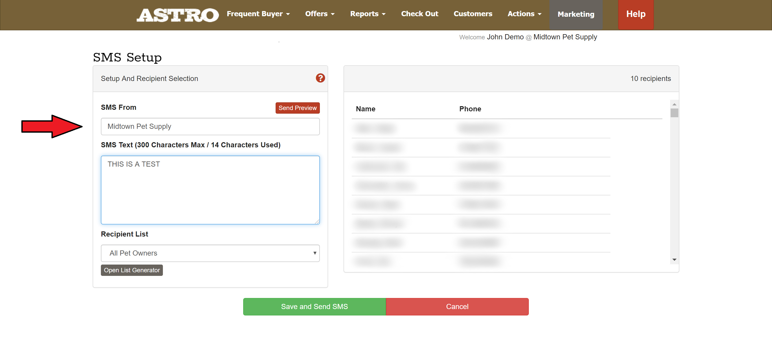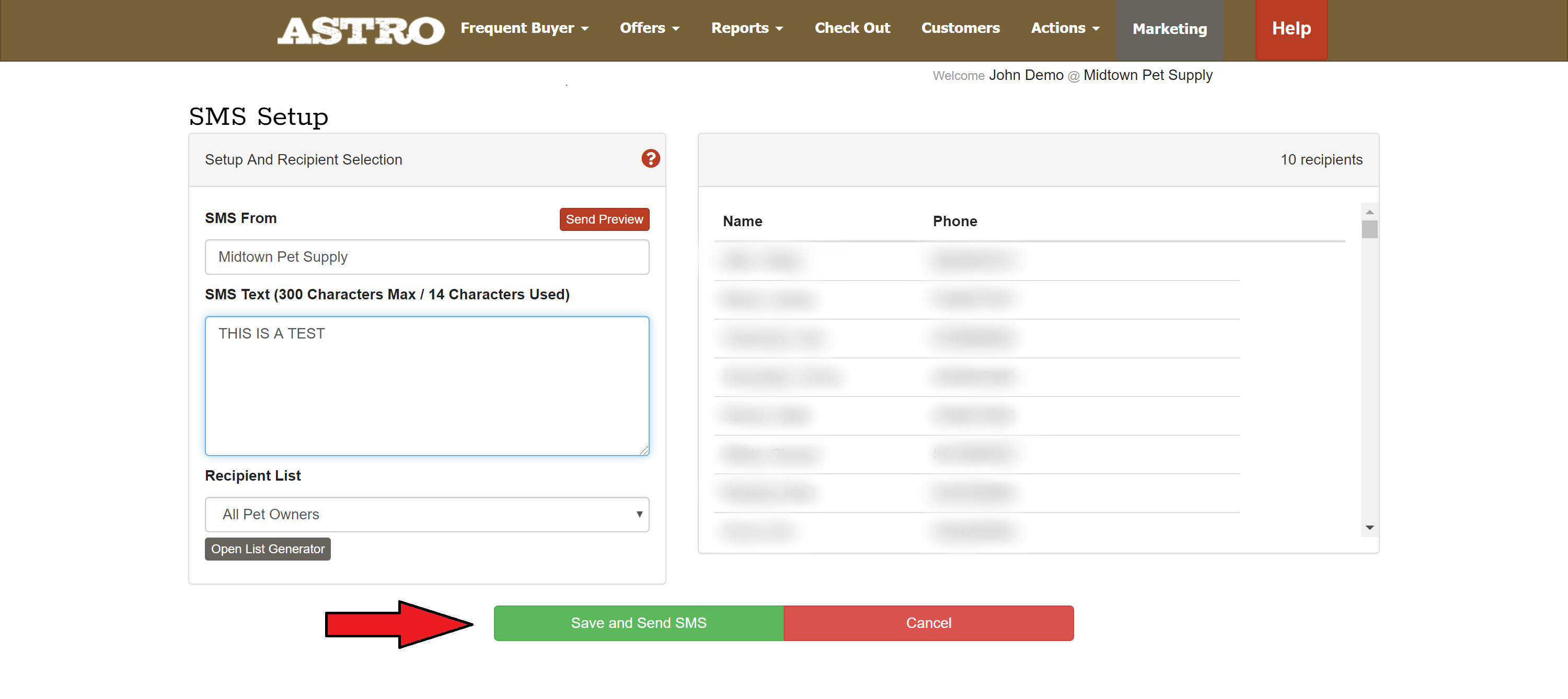 8. Once you have entered your message and selected the customers you would like to send this to, click on 'Save and Send SMS'.