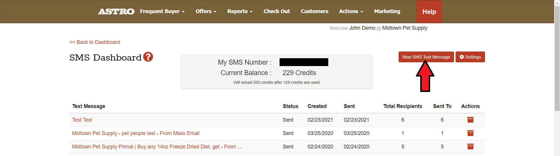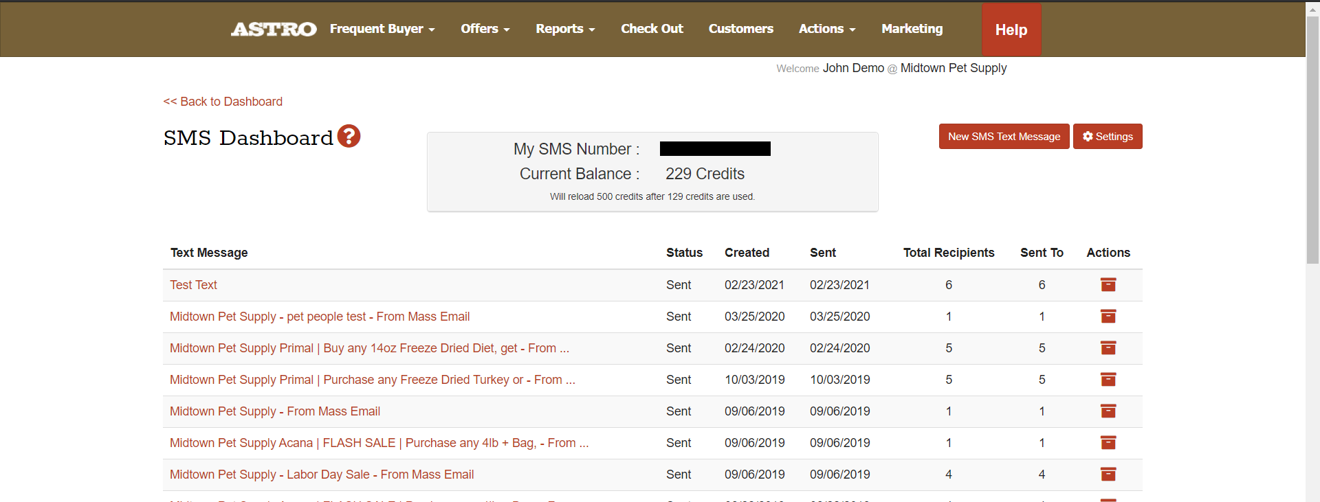 10. After your message has been sent, you will be taken back to the main SMS Dashboard page. Here you will see all of the texts that you have created and see the status of each one.