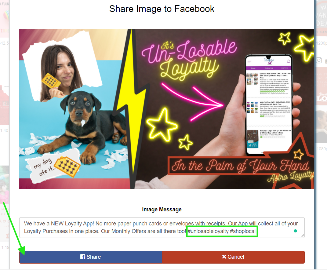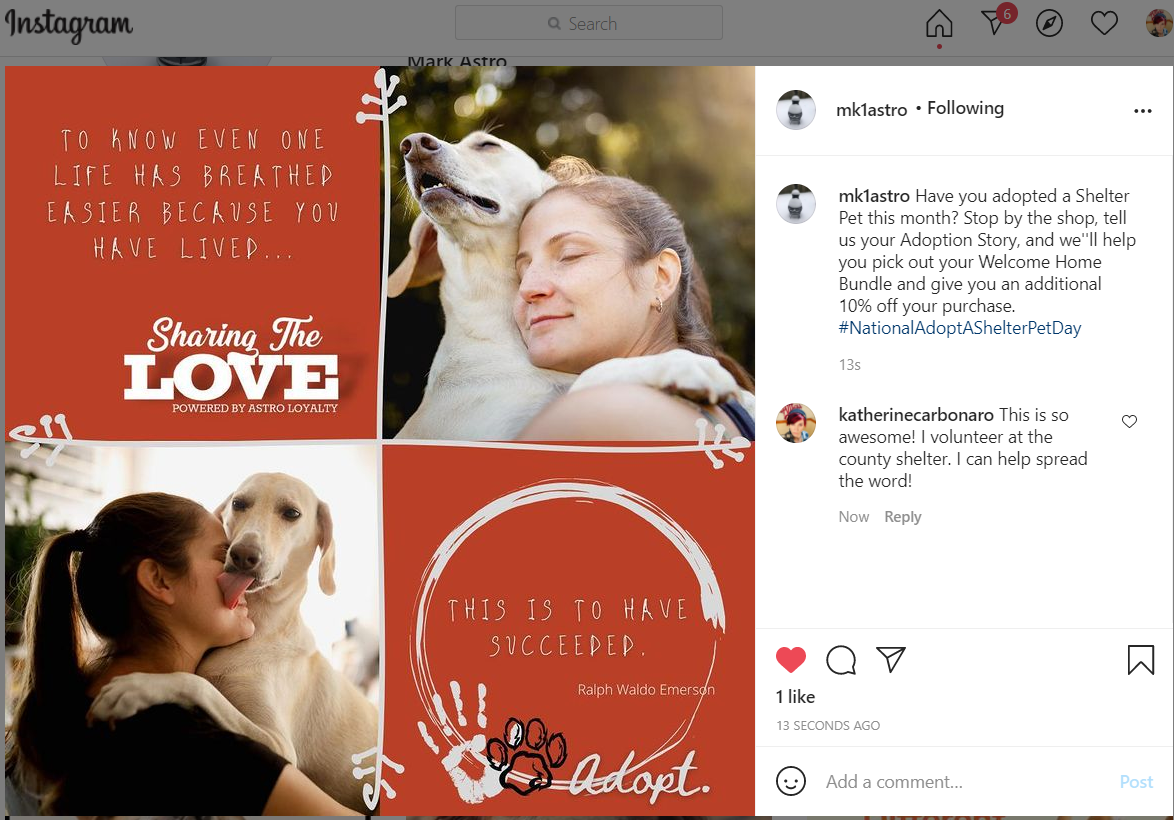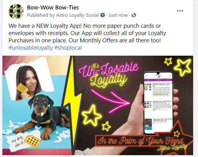 @astroloyalty for Instagram. So if you were to include @astropetloyalty in the Image Message for an Astro Social post to Facebook, Astro Loyalty will get an alert and will like your post!