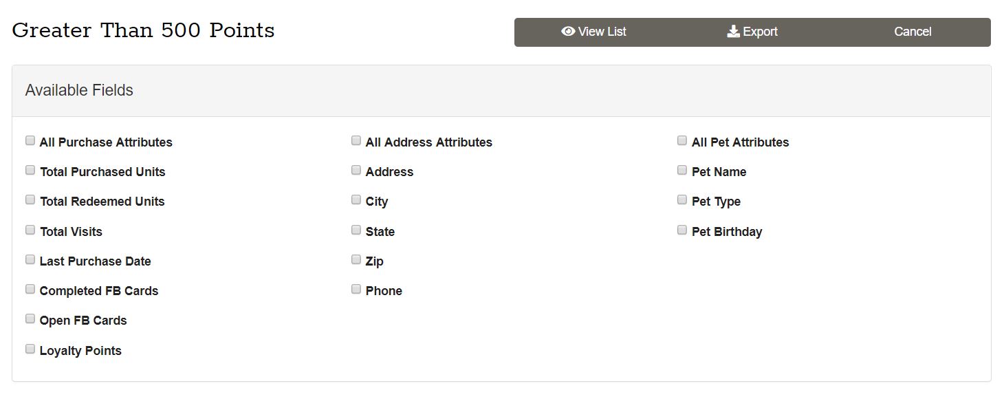 Your options include Purchase Attributes, Address Attributes, Pet Attributes. You can either select All for each group of attributes or you can select the individual ones you are most interested in.