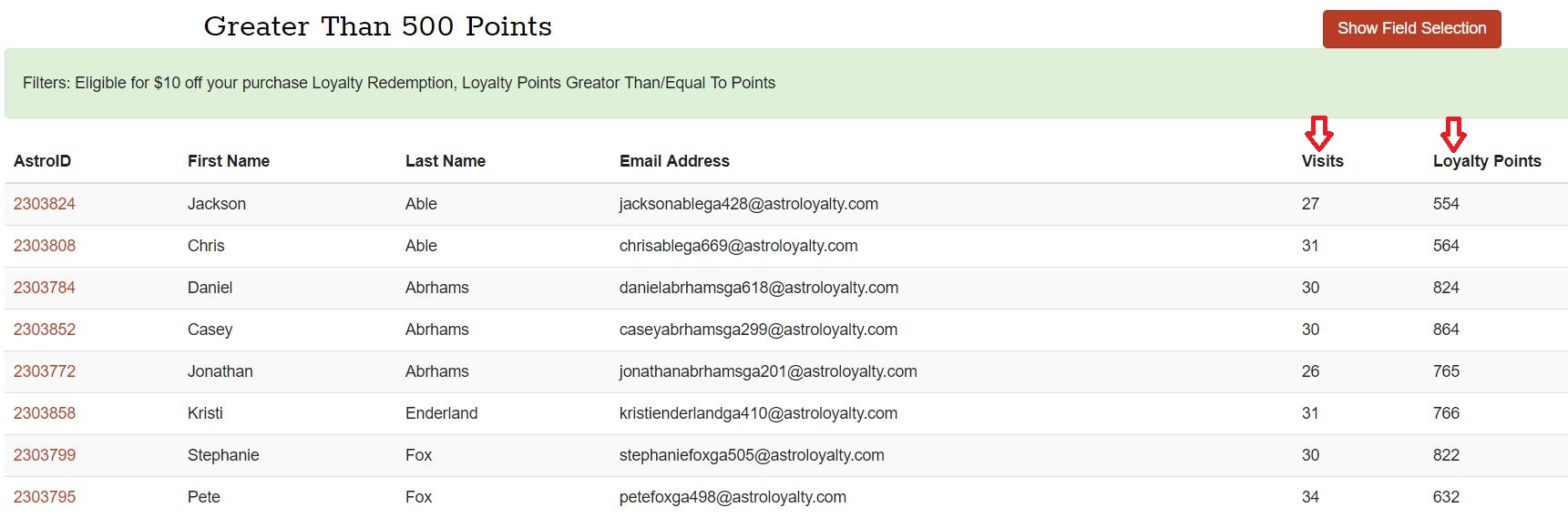 If you select View List with none of the Available Fields checked then you will be presented with a list of customers that includes just their Astro ID, First Name, Last Name, and Email Address. To return to the previous screen where the Available Fields are listed click the red Show Field Selection button.