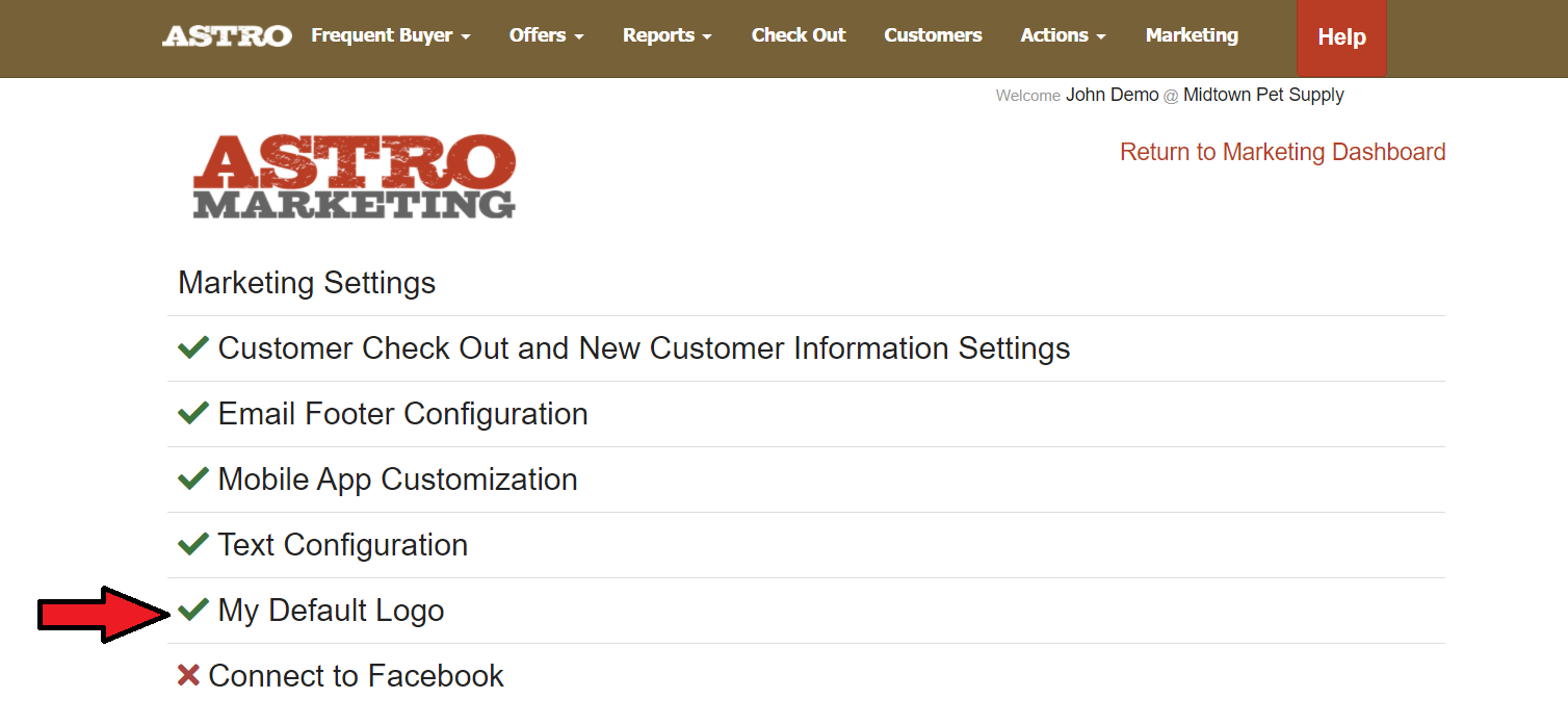 There are several features of your Astro Marketing Suite that can be customized to suit the needs of your store. The customizations can be found under the Settings. If your Marketing Settings are incomplete there will be a red alert icon beside the ...