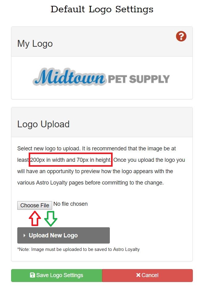 To add your logo to the Default Logo section click the Choose File button and select your logo from your computer. Once selected click where it says Upload New Logo. Now your logo will be displayed under where it says My Logo.