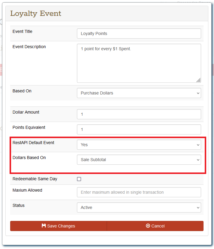 For the Loyalty Event, make sure to have the Rest API Event set to Yes.