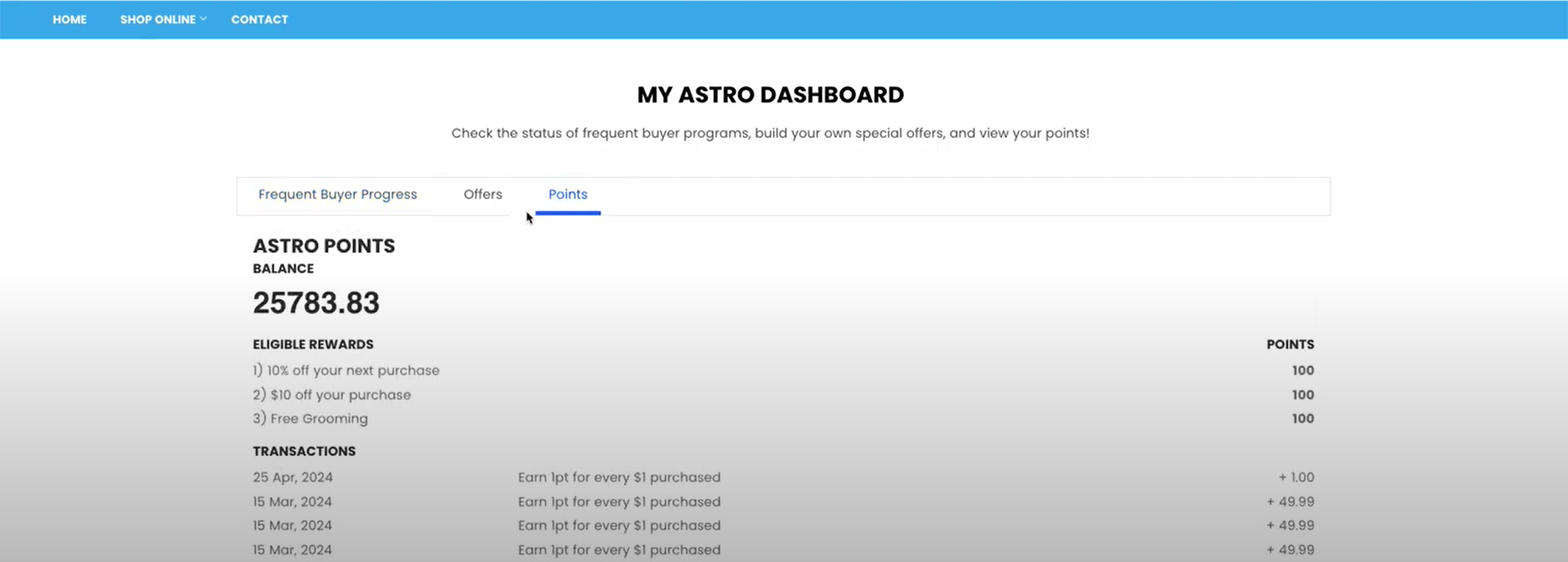3. This will show them their current Points total and any Eligible Rewards they have earned (based on the Rewards setup on your Loyalty Points program in Astro) and the previous Points transactions.