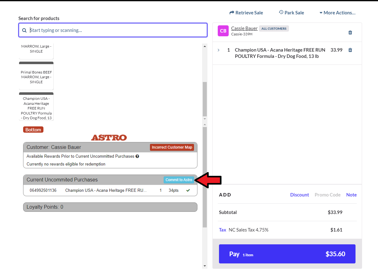 6. Select Commit to Astro. You will also see that it shows how many points they will be earning for this transaction.