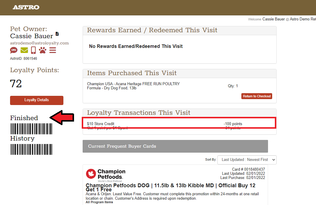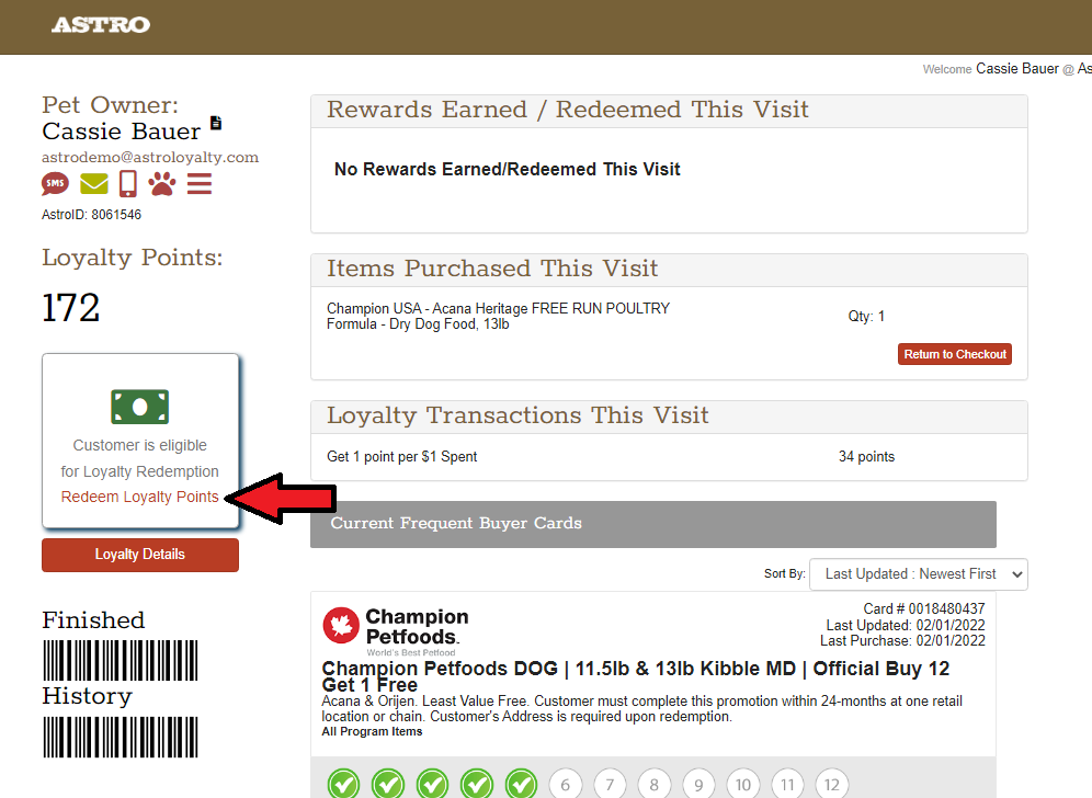 6. When in Astro, if the customer has earned enough points you will see a notice on the left.