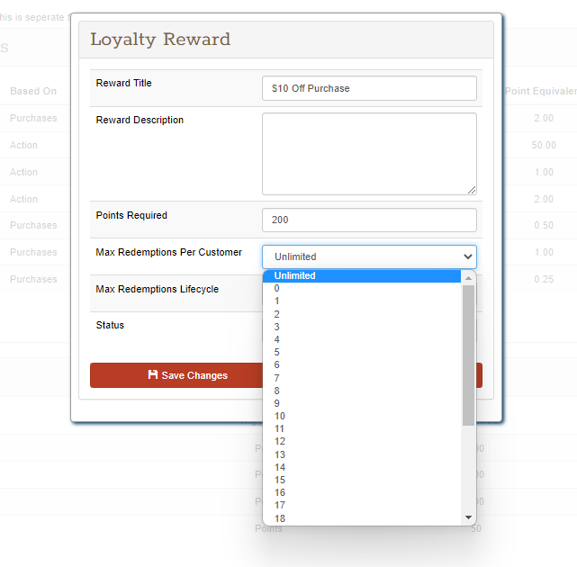 Allows you to set a limit for how many times the customer can redeem that particular Reward.