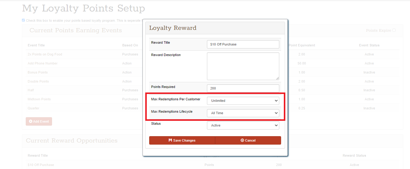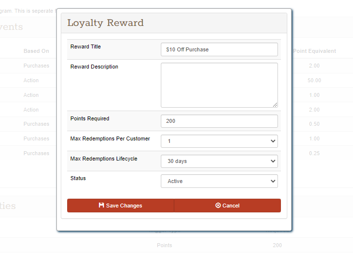 5. Once you have entered in and selected the options you would like, make sure the Reward is set to Active and can Save Changes.