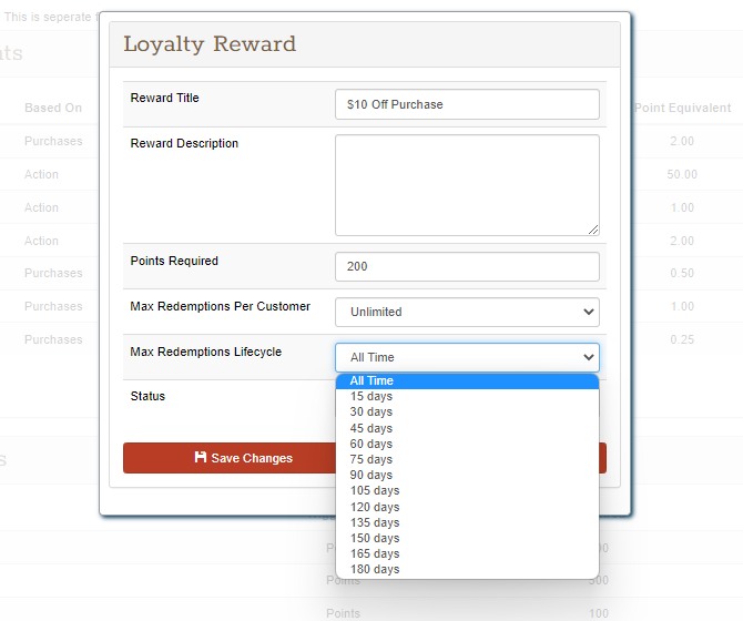4. Enter in the Reward Title, Description, and Points Required. Here you will see the two Max Redemption options.