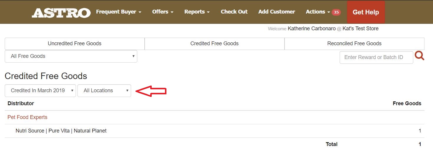 Personally, I think these reports are best managed from the Master Account. All of your free goods that are reporting to a distributor/vendor that you selected under your Frequent Buyer and Offers Enrollment Grids will compile under Distributor Free Goods Credit Status under your Reports menu. Here you will be able to view all uncredited and credited free goods reported by all locations (which is the default) or you can use the Location filter menu, located on each tab, to select a specific locations reported free goods.
